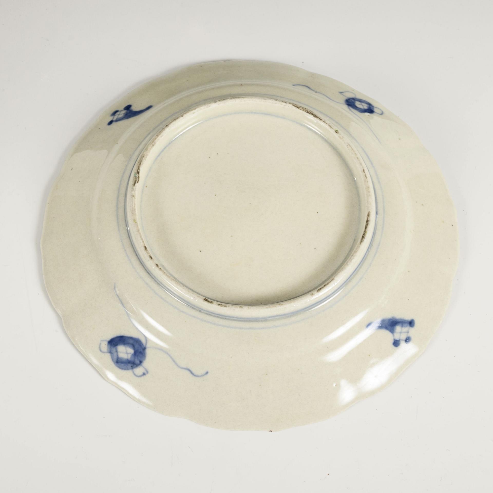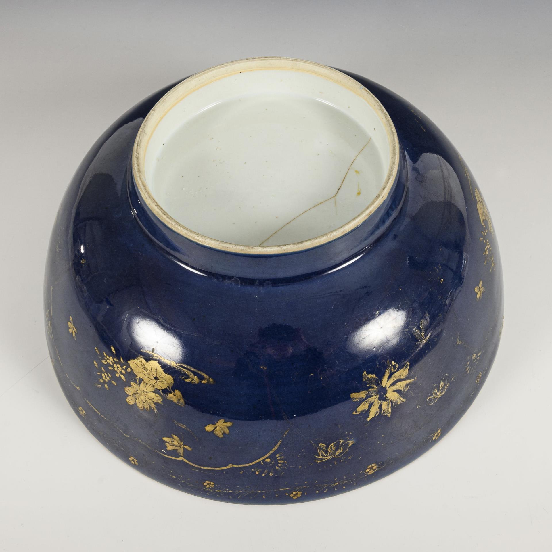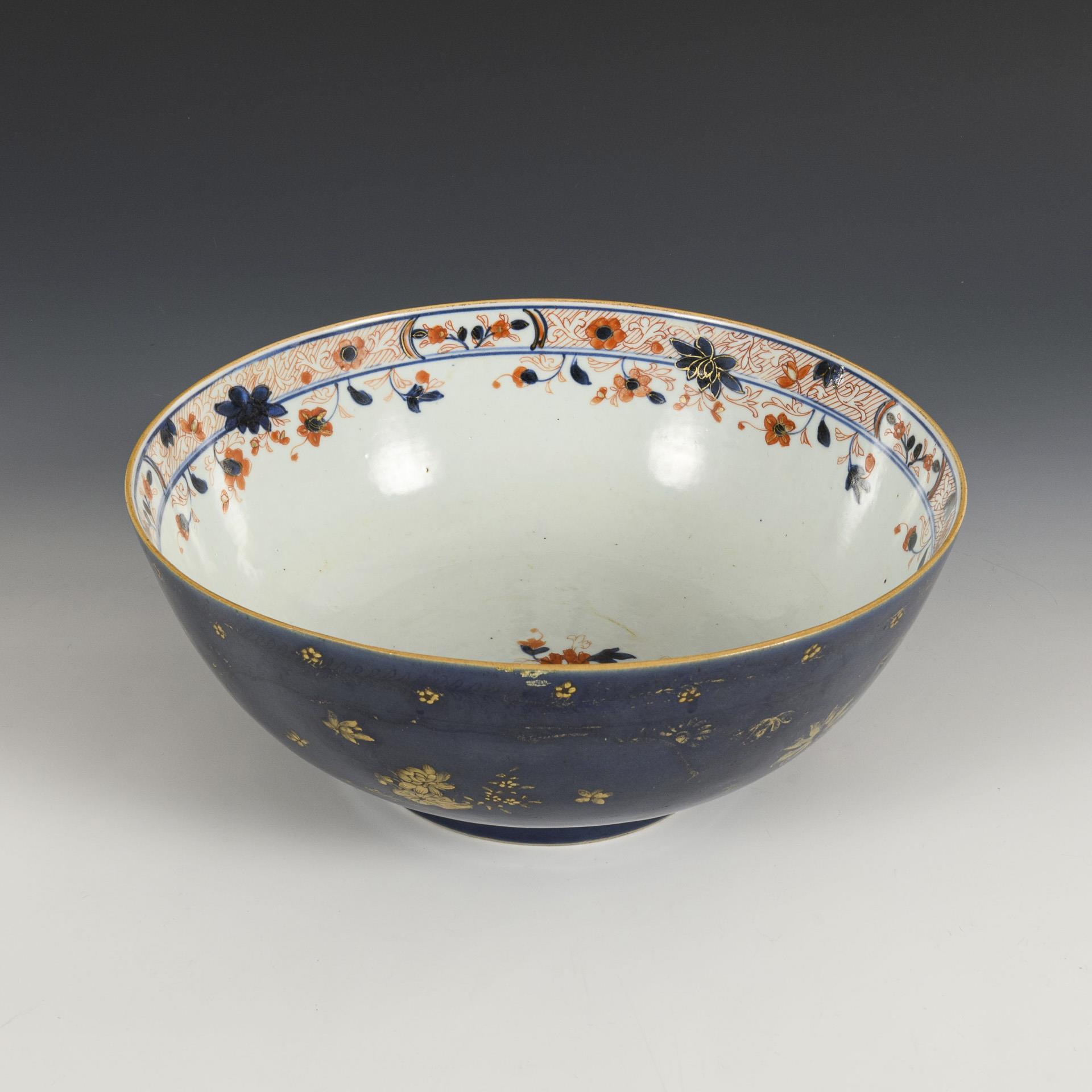 Bowl with gold-painted, midnight blue outer rim. Inside, discreet floral pattern in red and underglaze blue. Hairline cracks in the base, gold paint partly rubbed. (H 12.5 cm, Ø 30 cm). / Small plate with red and green enamel colors and underglaze blue. Small chip to rim. (Ø 21.5 cm).