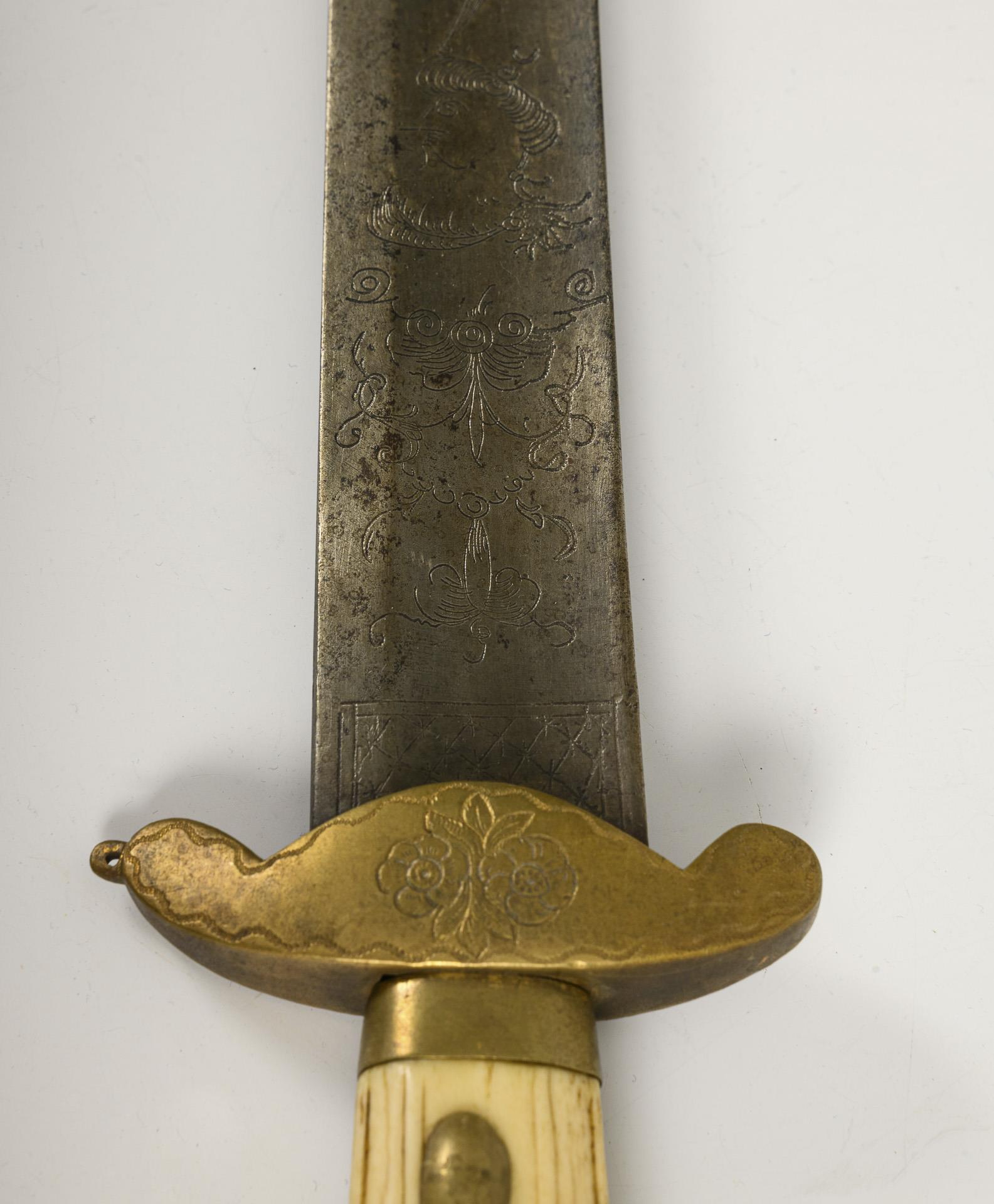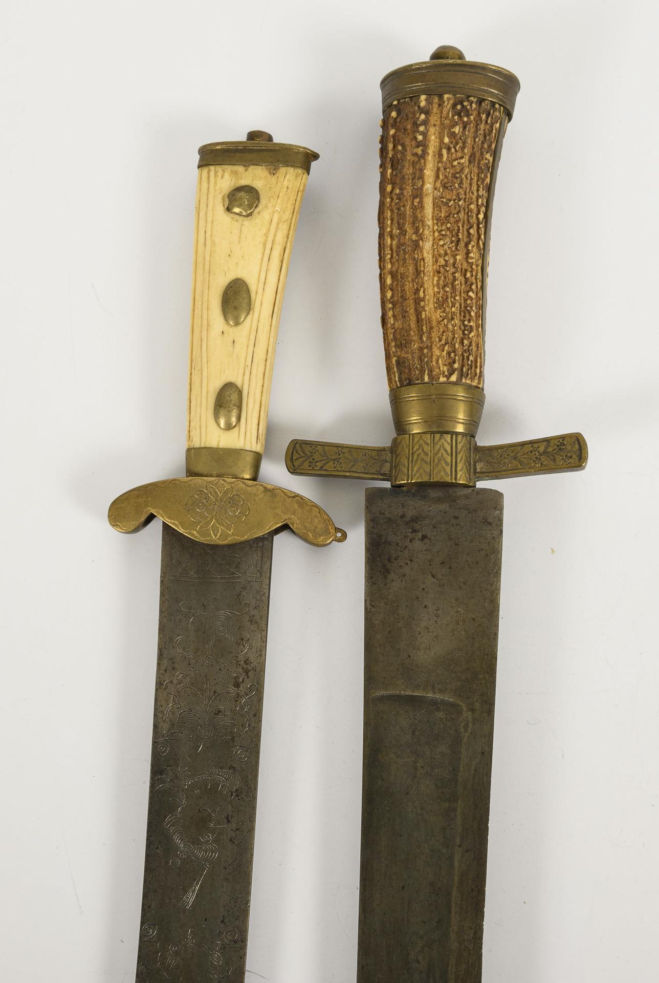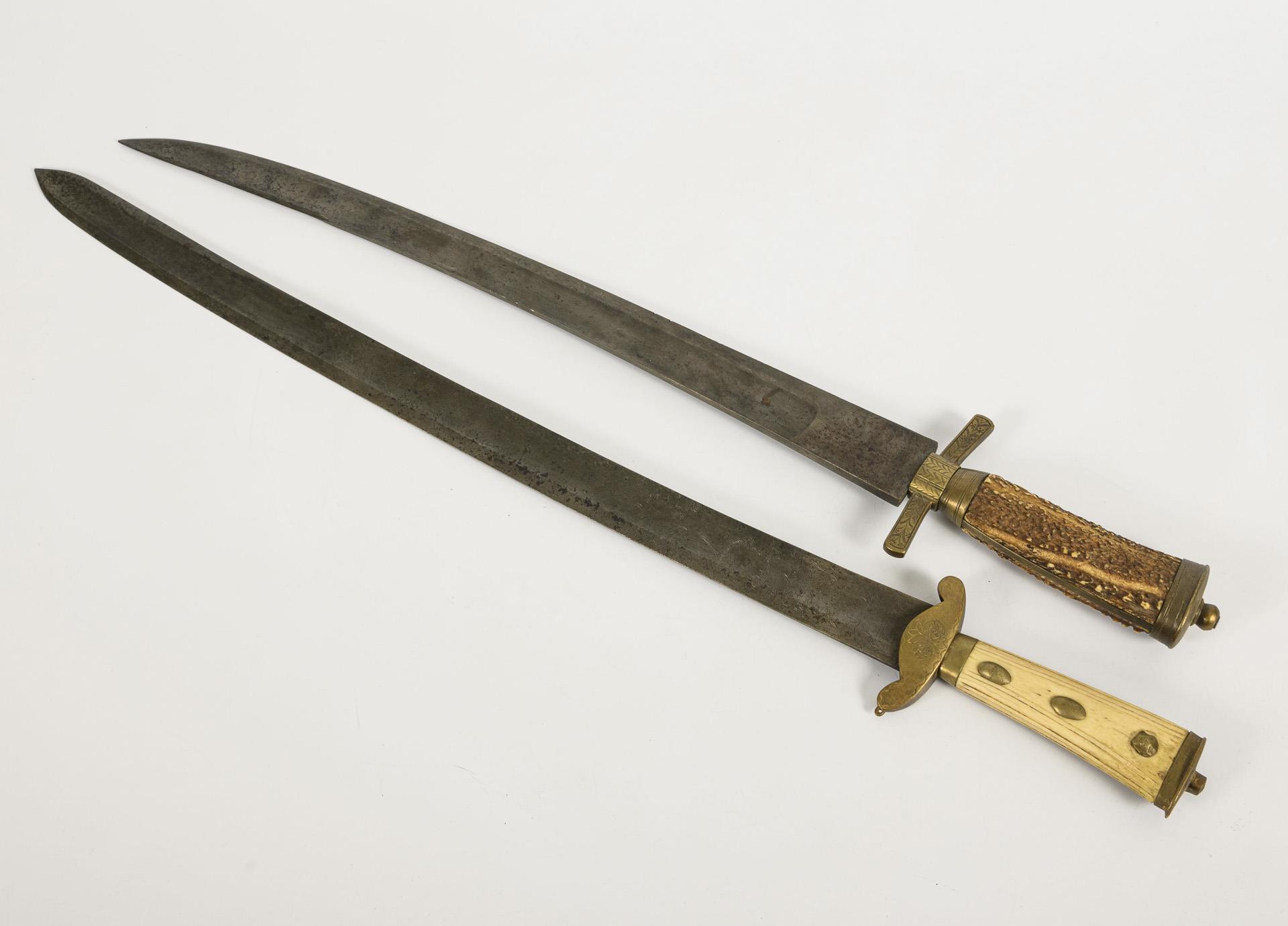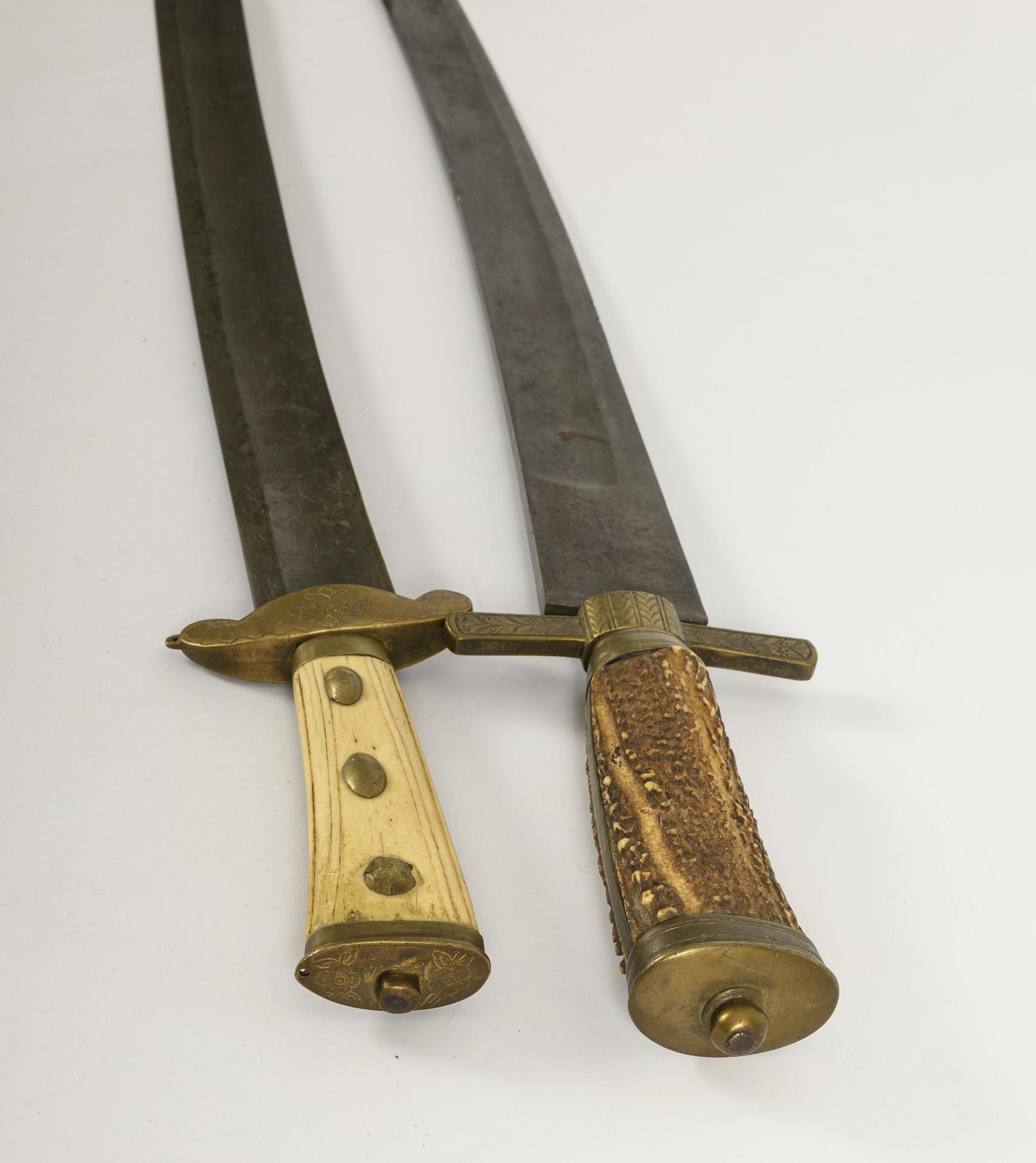 Hunting sword with staghorn grip: broad, curved, single-edged blade with wide fuller, point in the back line. Plain quillons with finely chiselled tendrils. Ball pommel. (L 70 cm). / Slightly curved, single-edged blade with a broad fuller. Baroque engravings with moon and 'Turk's head'. Bone grip with brass mountings. (L 75 cm).