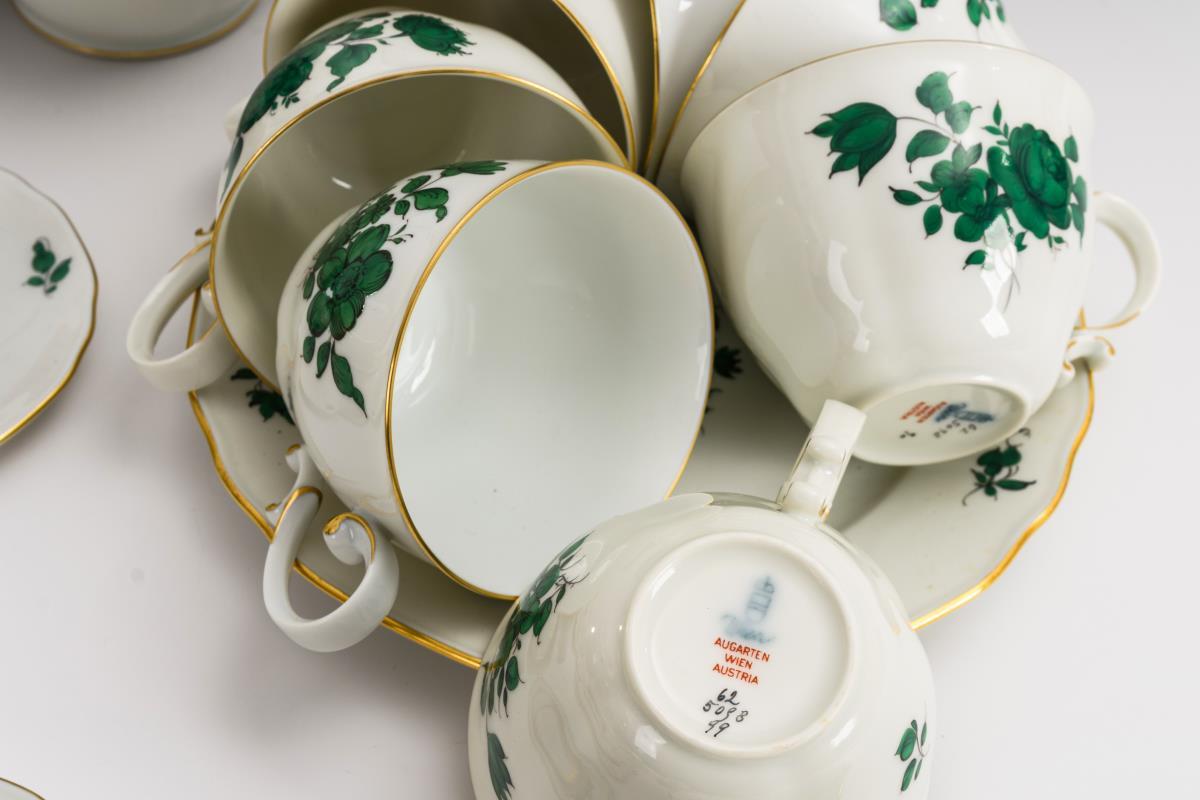 grünes Floraldekor, 8 Kuchenteller, 8 UT, Kuchenplatte, Kaffeekanne, Schälchen, Vase, Butterdose, 8 Kaffeetassen, 4 Eierbecher, Milchkännchen, Kerzenleuchter.