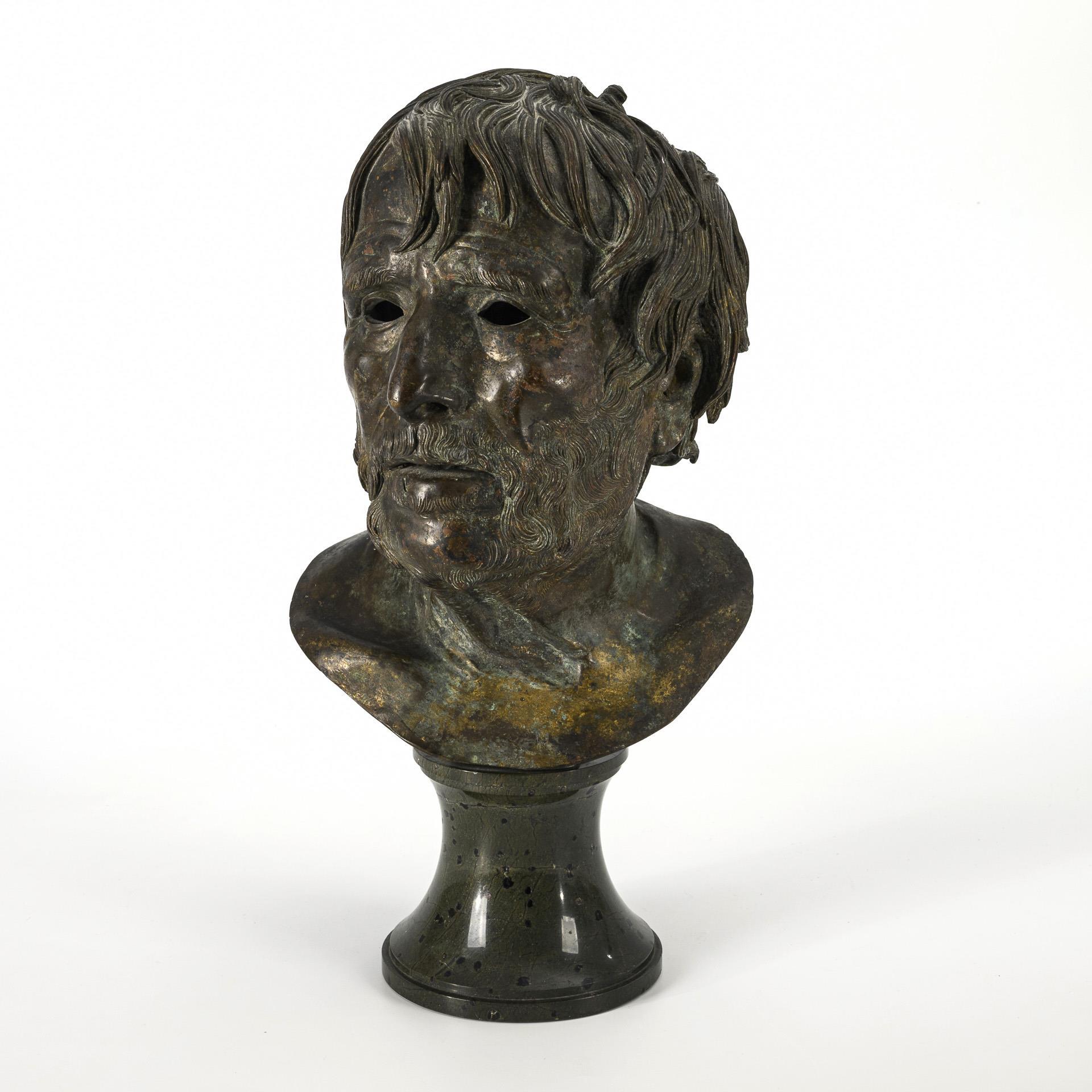 Exceedingly realistic portrait after the ancient bust from the Villa dei Papiri in Herculaneum, which is now kept in the Museo Archeologico Nazionale Naples. Here with slightly open mouth and without the eye inserts. Spotted patina (partly rubbed and corroded), notch on the lip.