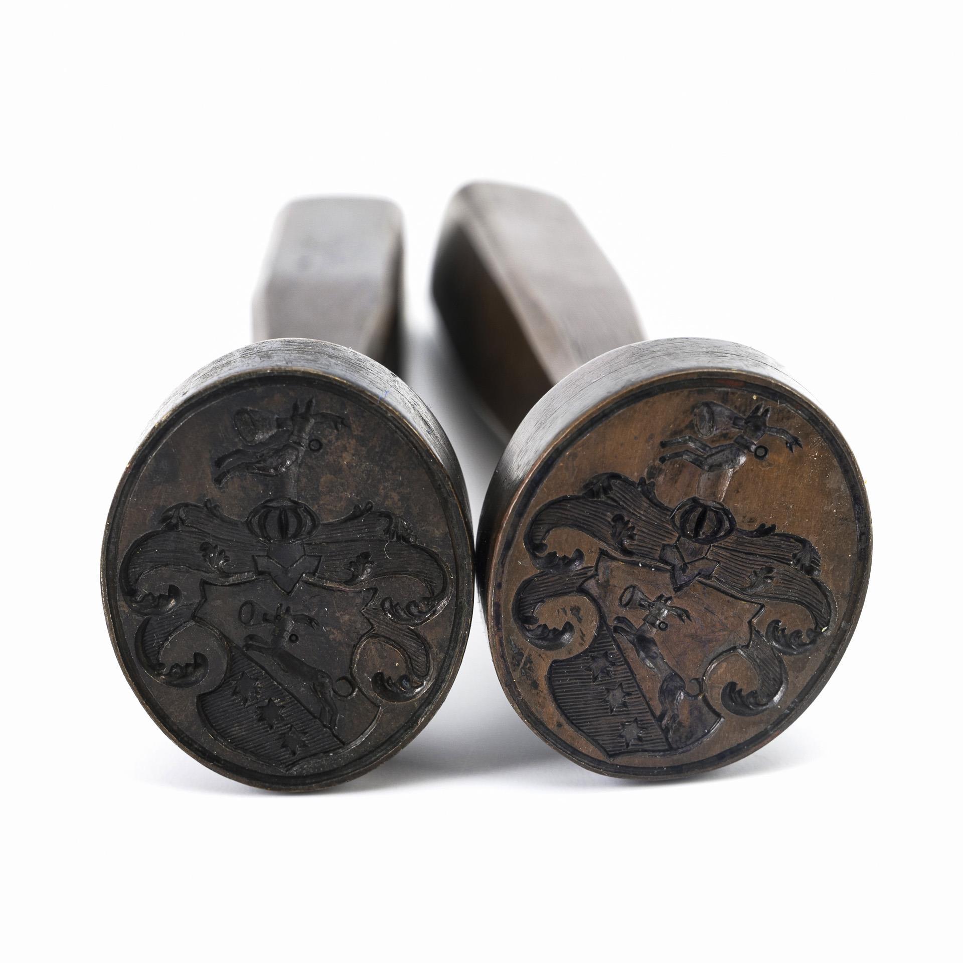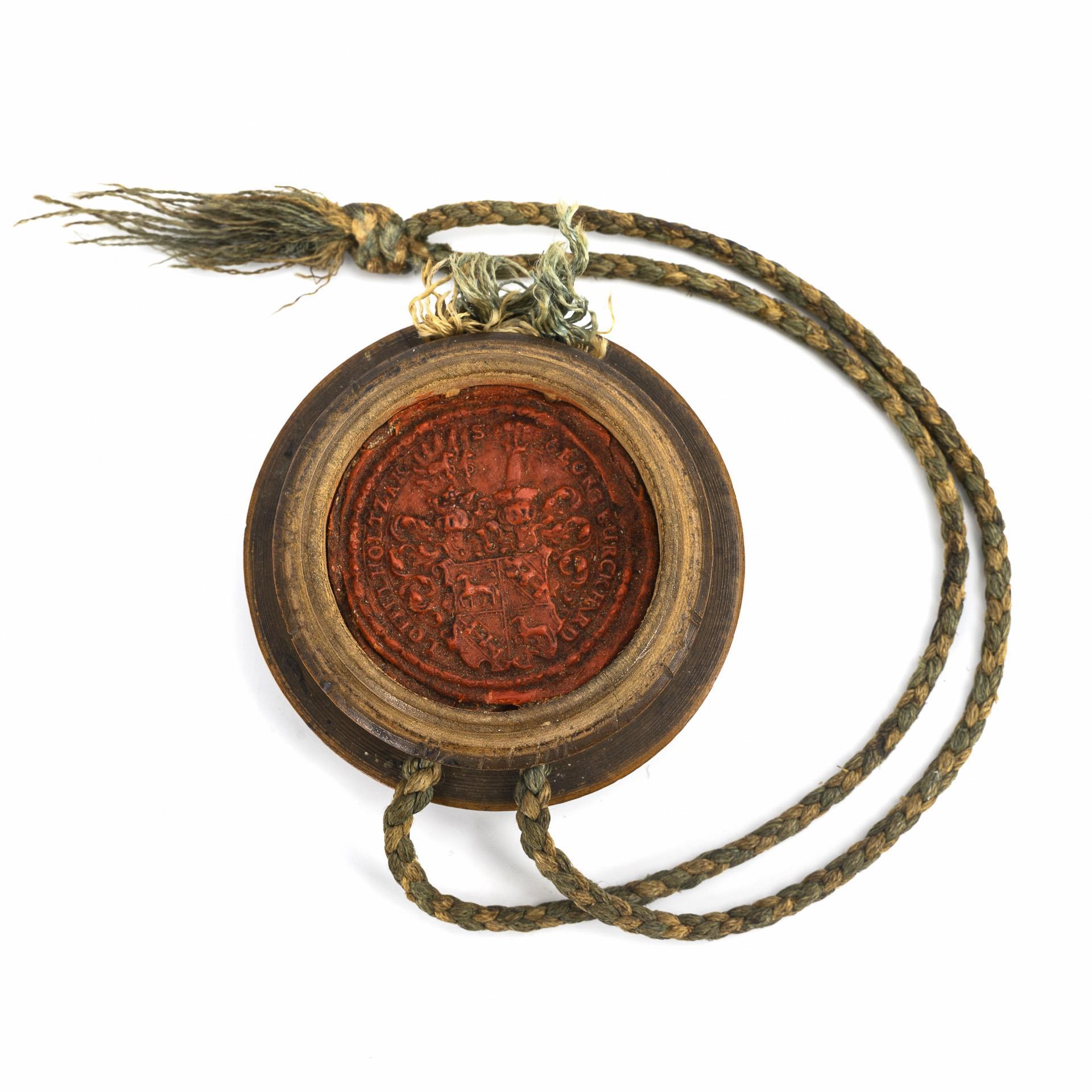 Baroque seal capsule made of maple wood, turned and carved, on a braided blue/yellow original cord; embossed "SW" on the lid. Inside intact red wax seal with the coat of arms of Georg Burkhard Löffelholz von Colberg (1664 - 1737), councillor in Nuremberg / 2 larger bronze seals with the same coat of arms. Each with engraved monograms: Art Nouveau silver petshaft (tested), 2 identical petshafts with wooden grip, 2 small bronze typare. / Silver berlock (proofed) with acorn; monogram "EHD" engraved. Hardly any signs of age/use.