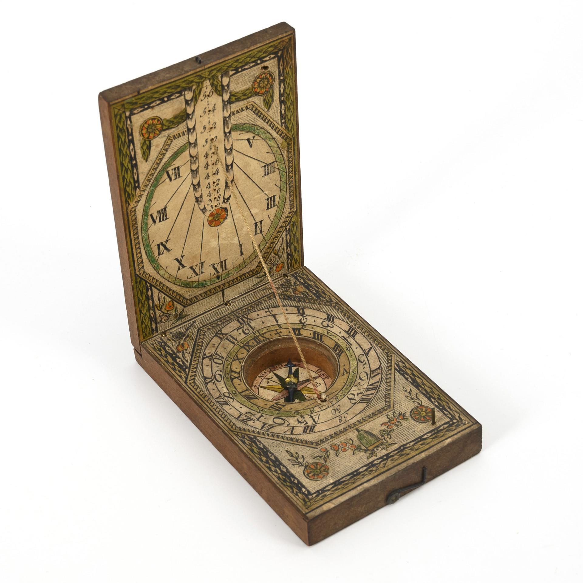 Pocket sundial with hook clasp on the rectangular case. Alphabetical list on the hinged lid with the northern latitudes for 47 European cities. Can be used as a horizontal and vertical sundial; inside corresponding dials with Roman and Latin hour numerals in an ornamental frame. Guide holes for the shadow cord corresponding to the degrees of latitude (36 - 56). Central recessed compass with colored compass rose. Compass glazing missing (pin present), 1 case hook and protective knob missing, scales browned, stain on the lid.