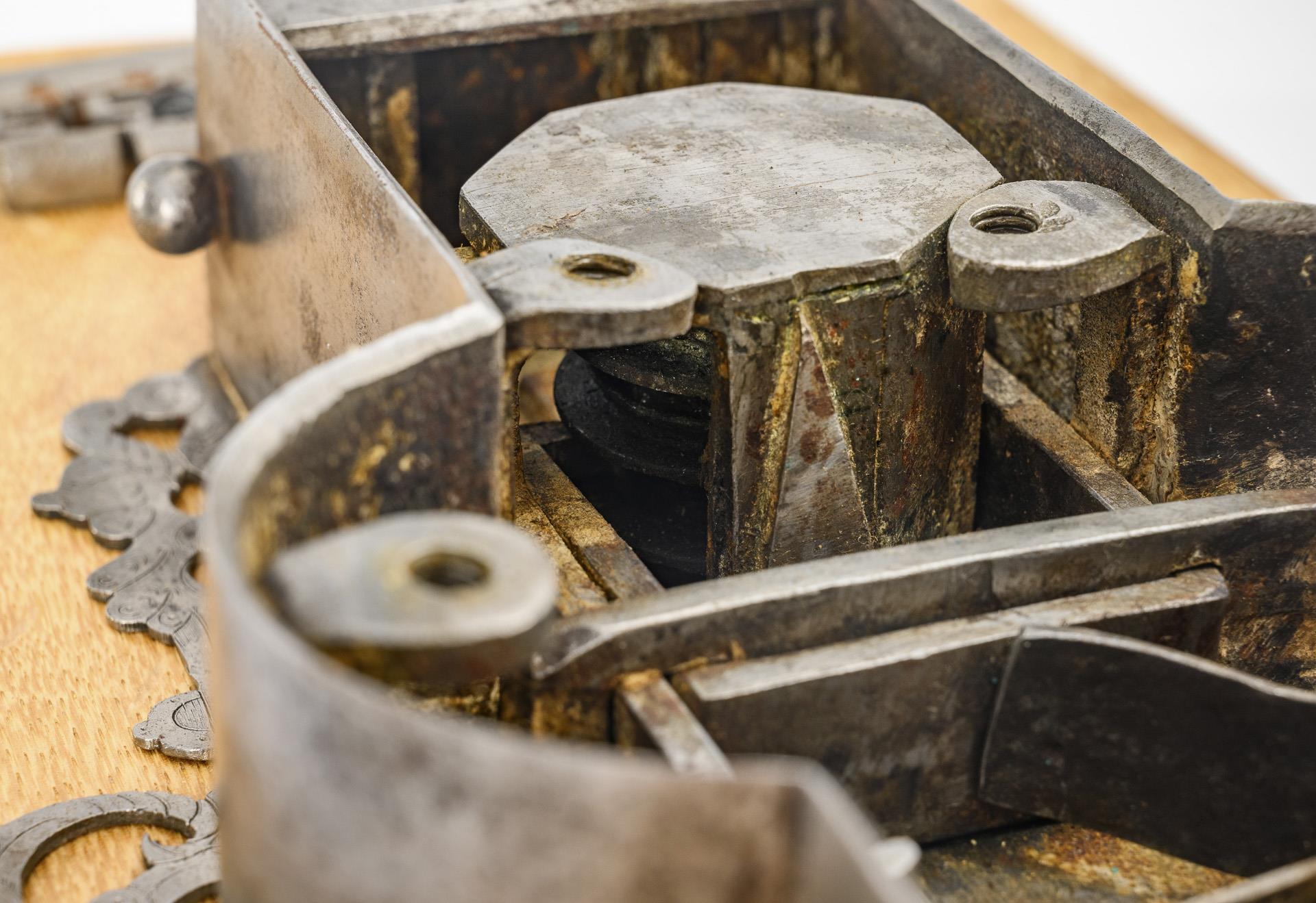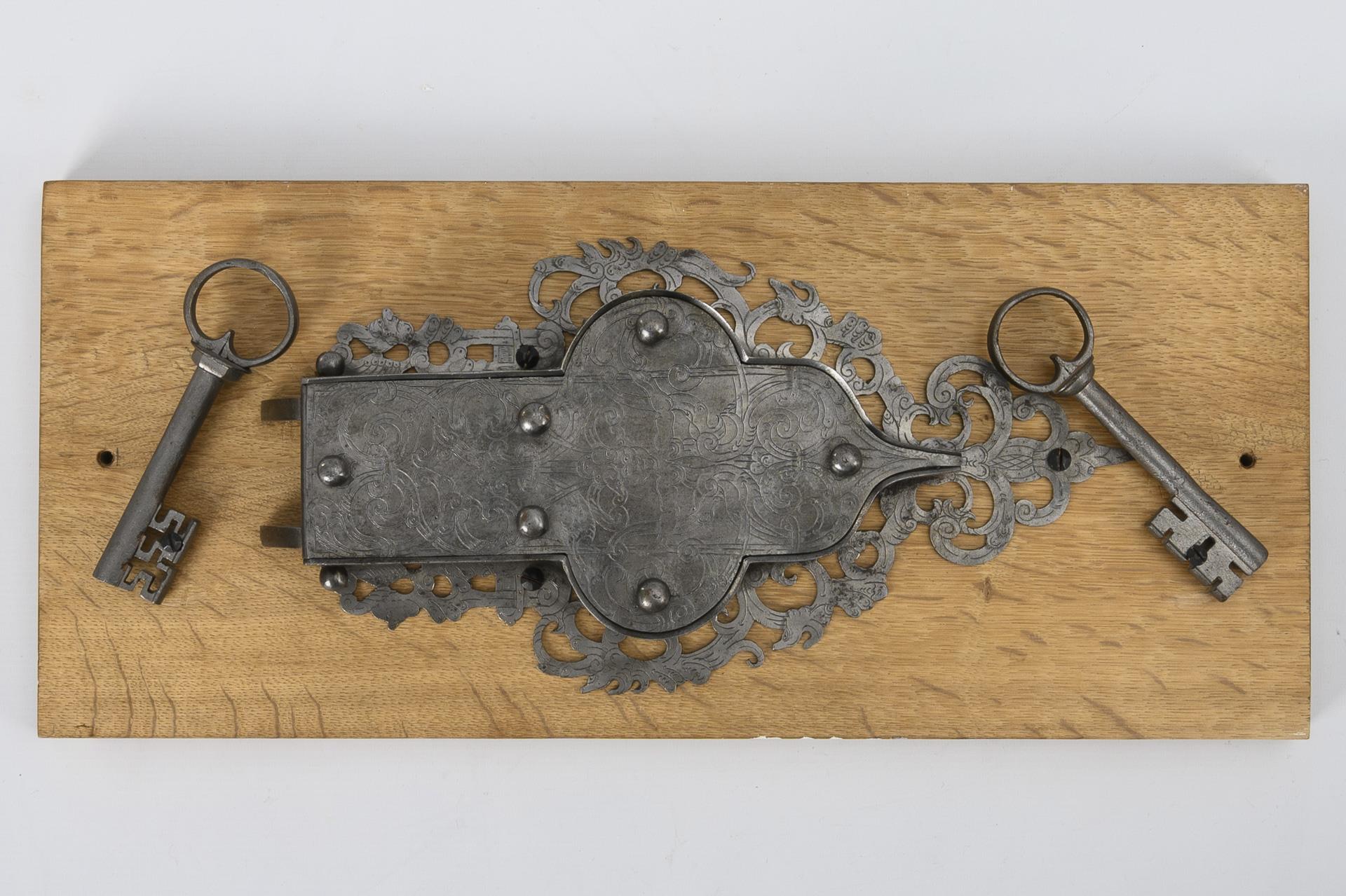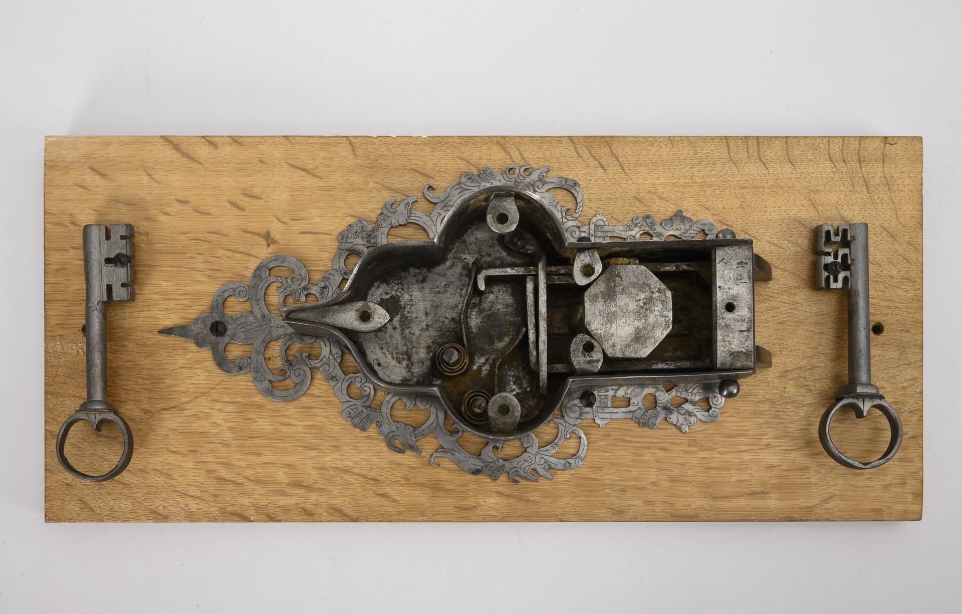 Wrought iron, oak panel. Lock case 13 x 24.5 x 5 cm, panel 22 x 50 cm. 4.2 kg.