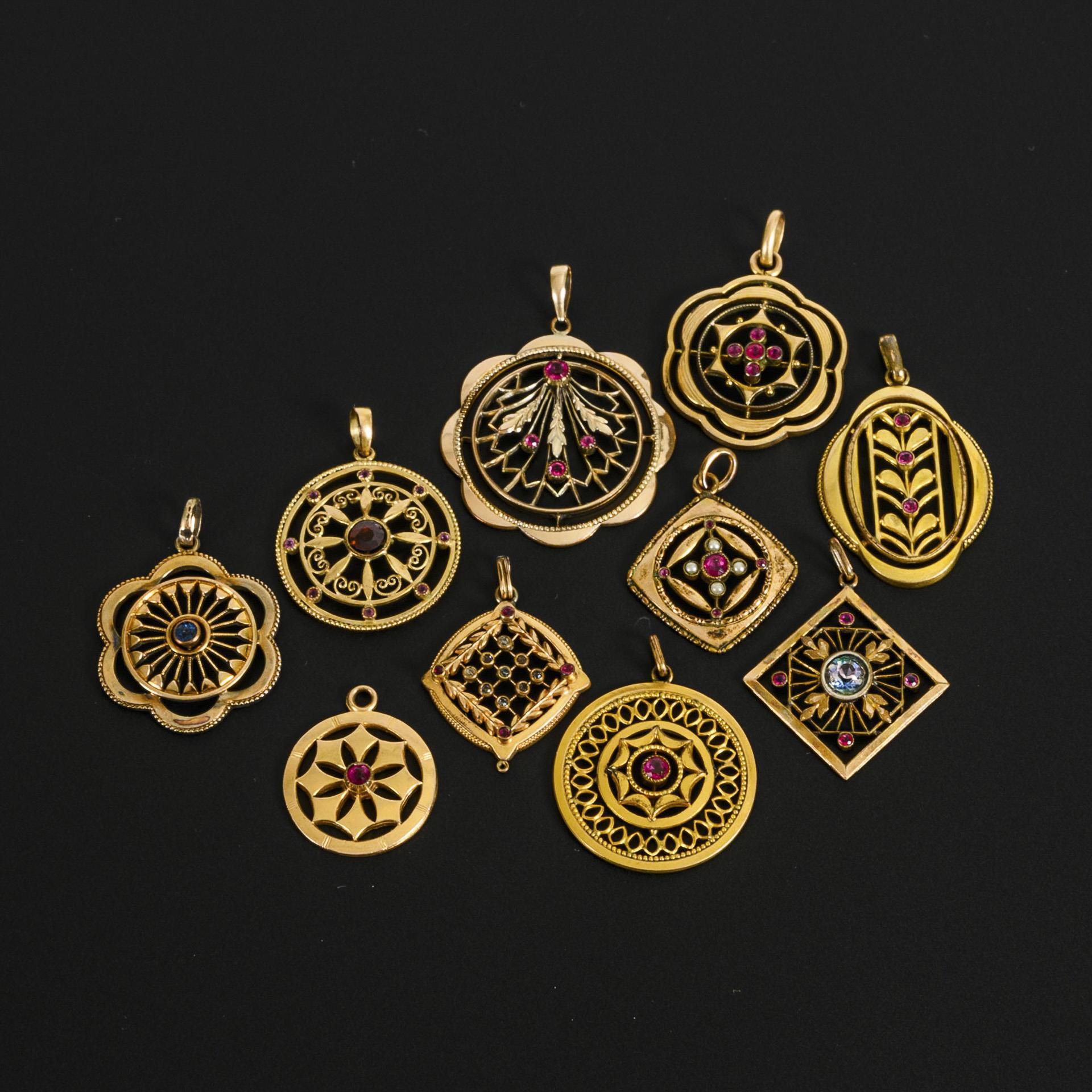 A collection of 10 Art Nouveau pendants, some set with ruby/sapphire, Rhine pebbles and seed pearls.