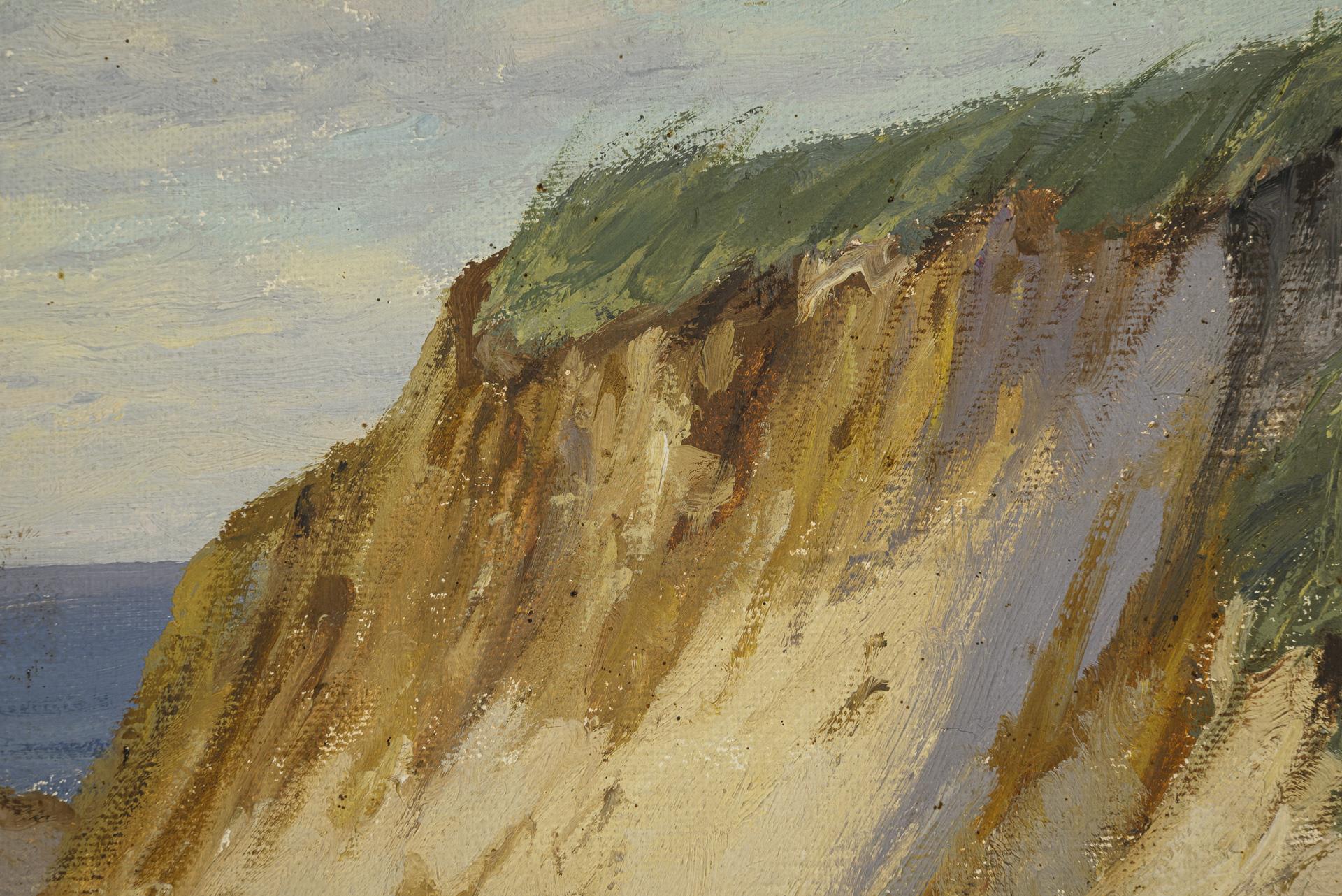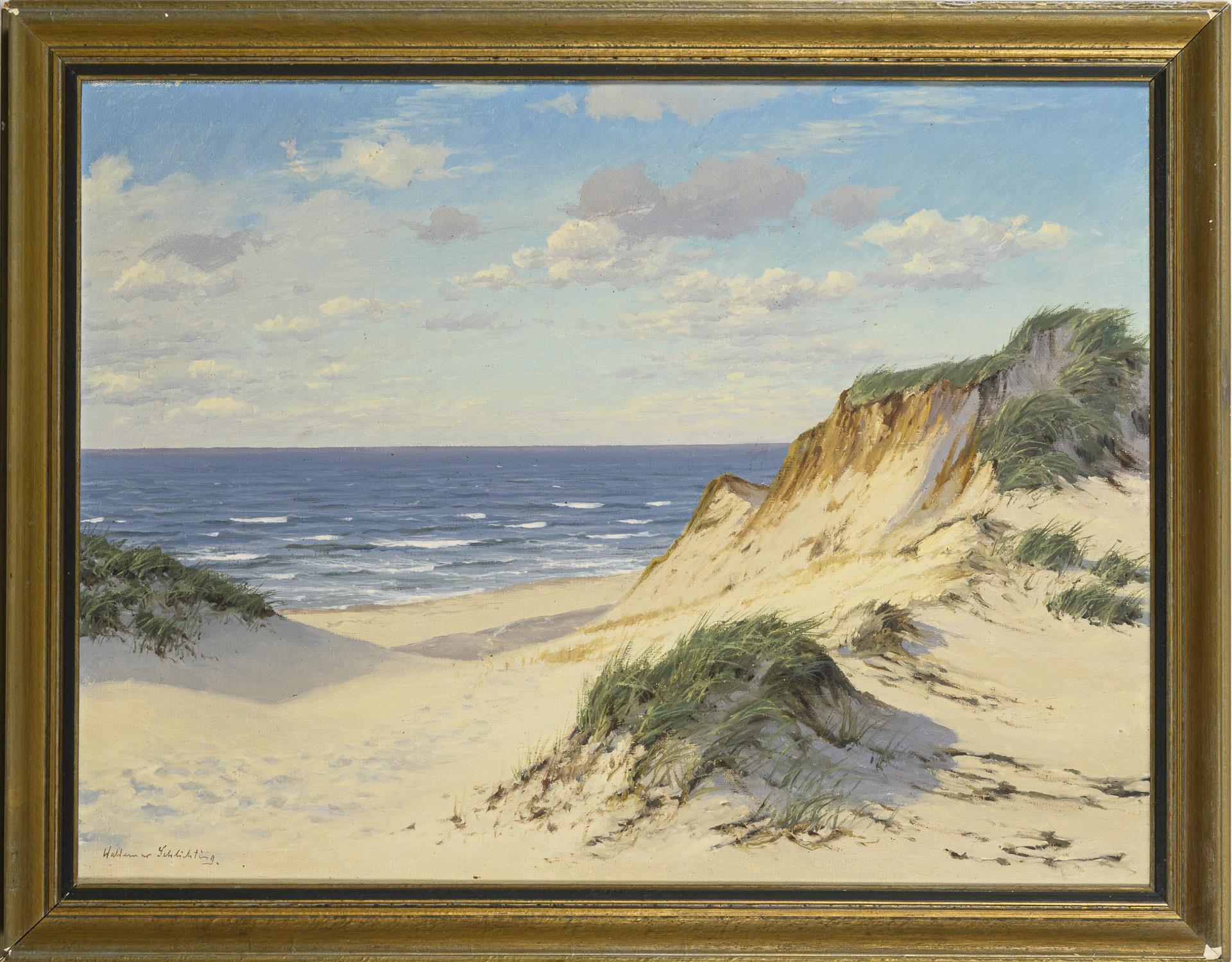 Waving grass on the dunes in the sunshine in front of the calm sea. Restored with backing.