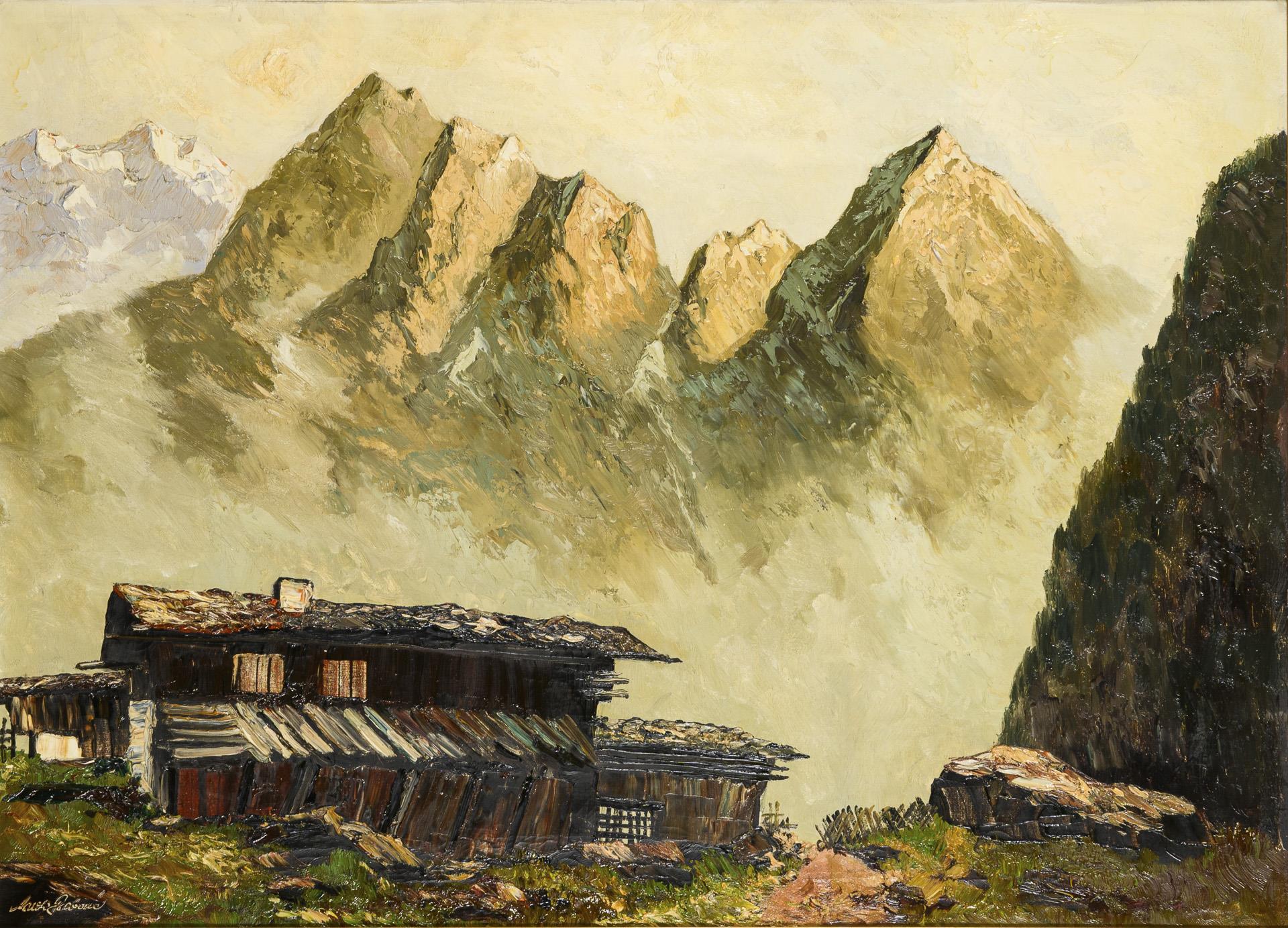 Partly impasto-painted mountain landscape with an Alpine house on a misty gorge in front of the peaks.