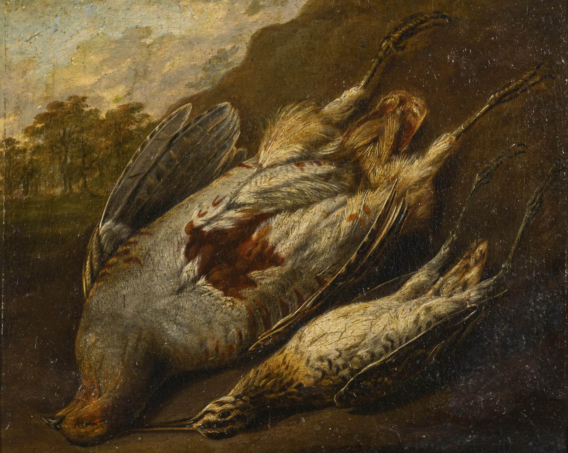 The two hunted animals on a mound of earth in front of a wide grass and forest landscape. Two small restored areas.