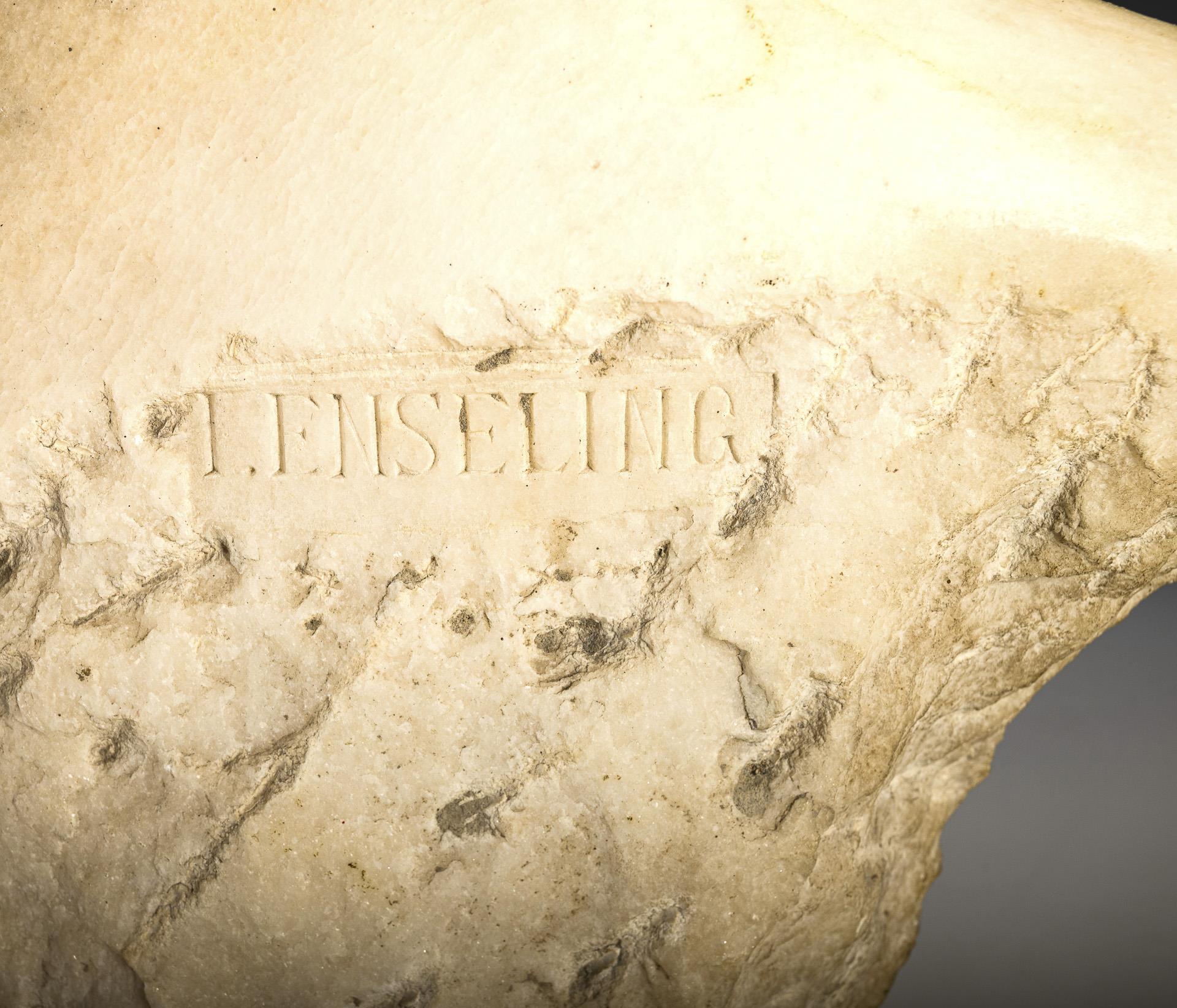 Portrait of an attractive beauty looking up slightly to the side with a topknot at the nape of her neck. The contrast between the natural "base" and the finely smoothed areas of skin is charming. 1 ear glued, 1 small indentation in the hair.