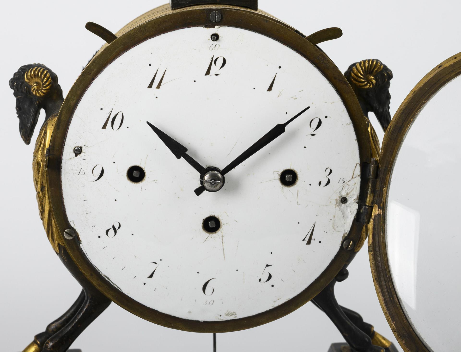 Stepped base with arched segment, crowning clock drum with eagle crown and lateral trestle feet with ram's crests. Signs of age and wear, rubbing, dial with defects.