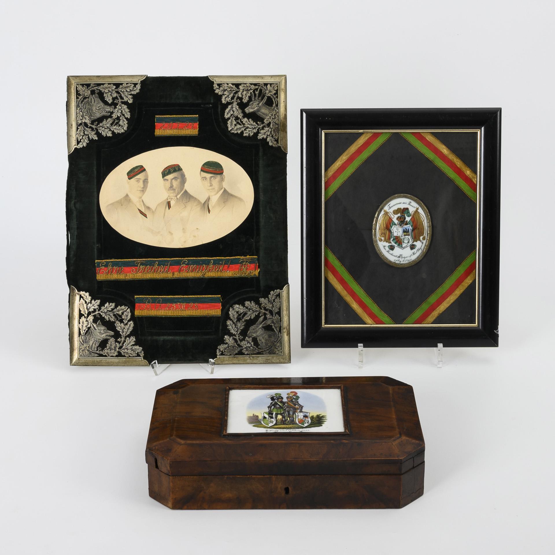 Walnut veneered and mahogany stained box; porcelain or frosted glass pane with enamel painting on the hinged lid: 2 knights each with fraternity coat of arms (including Franconia Jena) with dedication and date 1855 / Porcelain plaque with painted coat of arms of the Corps Franconia Jena as well as dedication and date 1886/87 in the glazed frame with enclosed coleur band. / Colored photo of three gentlemen, flanked by the embroidered coleur ribbon in the colors of the Corps Franconia Jena with the dates 1921 and 1928; laminated on a board covered with green velvet with silver-colored corner overlays in the form of engraved animals (boar, deer, fox and hare). Casket in need of restoration, signs of age/use on the board and the photo.