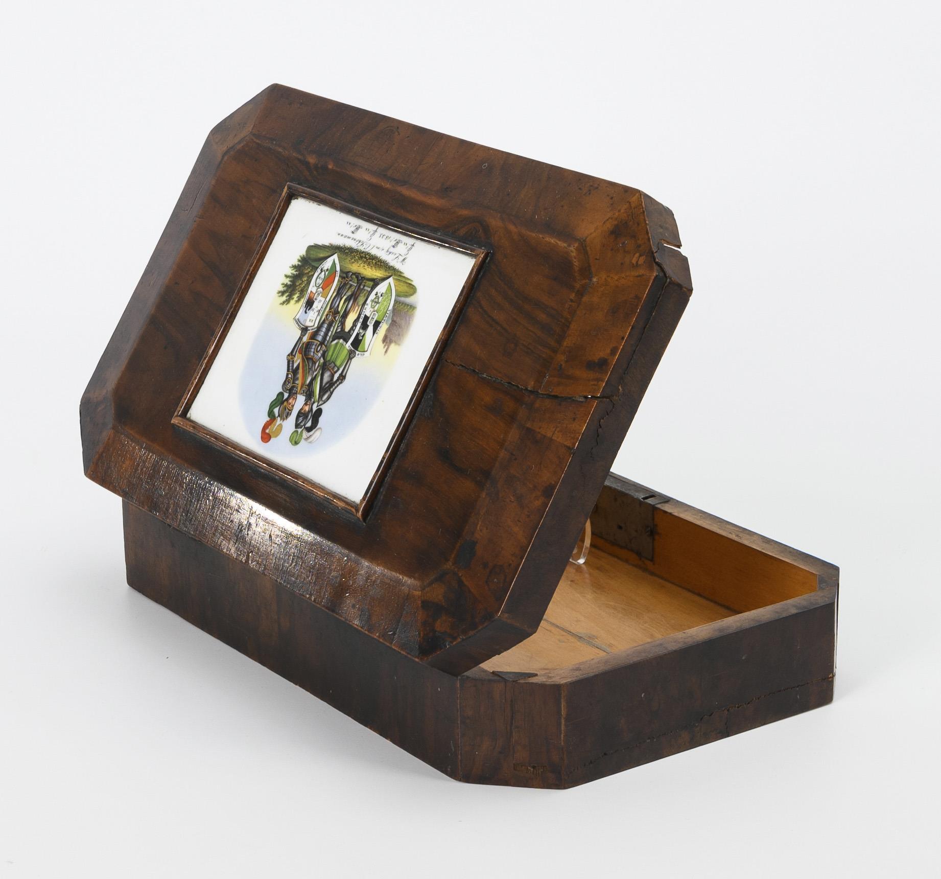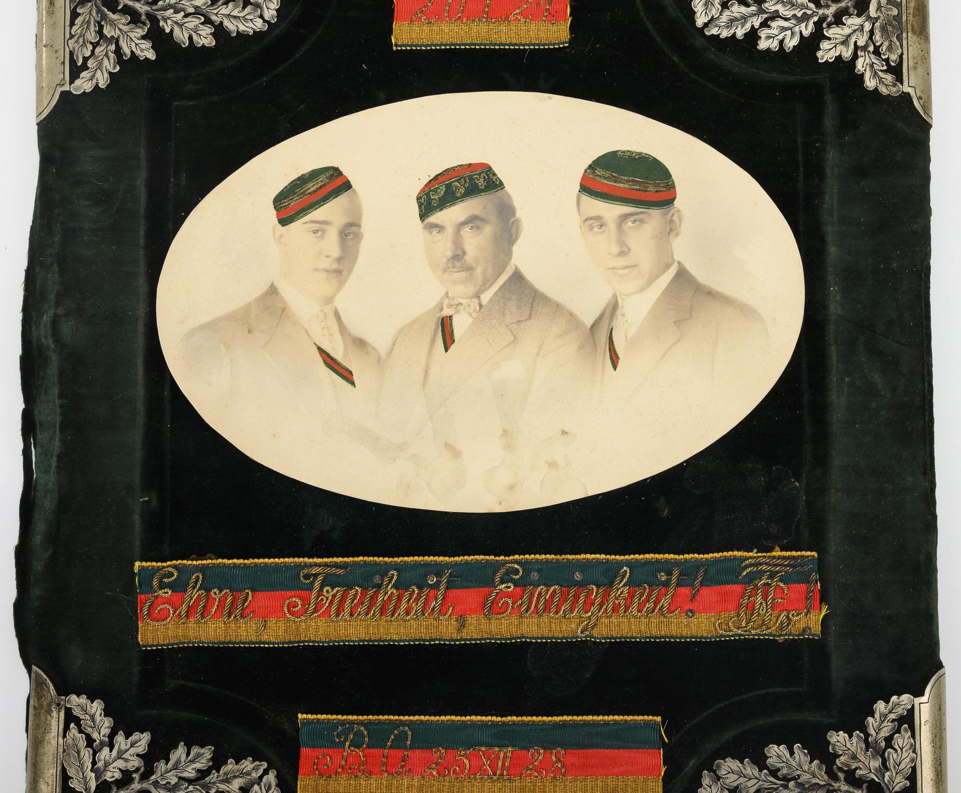Walnut veneered and mahogany stained box; porcelain or frosted glass pane with enamel painting on the hinged lid: 2 knights each with fraternity coat of arms (including Franconia Jena) with dedication and date 1855 / Porcelain plaque with painted coat of arms of the Corps Franconia Jena as well as dedication and date 1886/87 in the glazed frame with enclosed coleur band. / Colored photo of three gentlemen, flanked by the embroidered coleur ribbon in the colors of the Corps Franconia Jena with the dates 1921 and 1928; laminated on a board covered with green velvet with silver-colored corner overlays in the form of engraved animals (boar, deer, fox and hare). Casket in need of restoration, signs of age/use on the board and the photo.