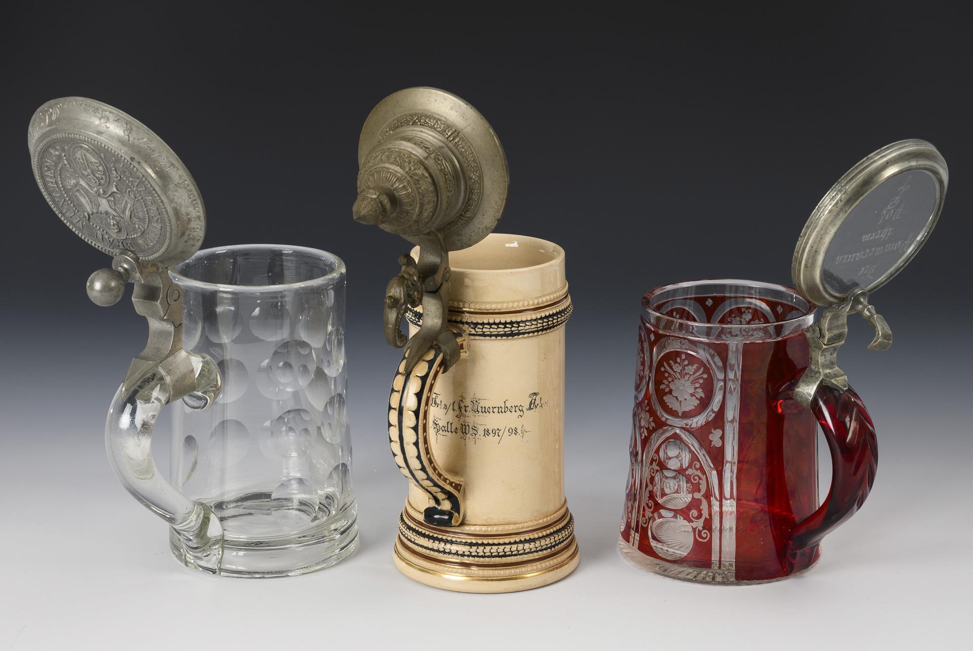 Glass jug with lens cut, hinged lid in relief with Münchner Kindl and inscription "Augustiner Bräu München" and dedication engraving by H. K Lempertz to R. Büngner Munich 1901/02. / Red stained glass jug with engraved names in the lenses as well as pointed arches and floral medallions. On the glass lid "Die Pommerania ihrem P.o.l. sowie Zirkel. / Ceramic jug with painted coat of arms of Suevia Strassburg and dedication by Fr. Guradze to Fr. Nuernberg Halle 1897/98. Relief pewter lid with grotesque pusher. Glaze hairline cracks in the ceramic base.| Addendum 25.02.25: On the glass jug with lens cut, stress crack in the wall at the lower base of the handle