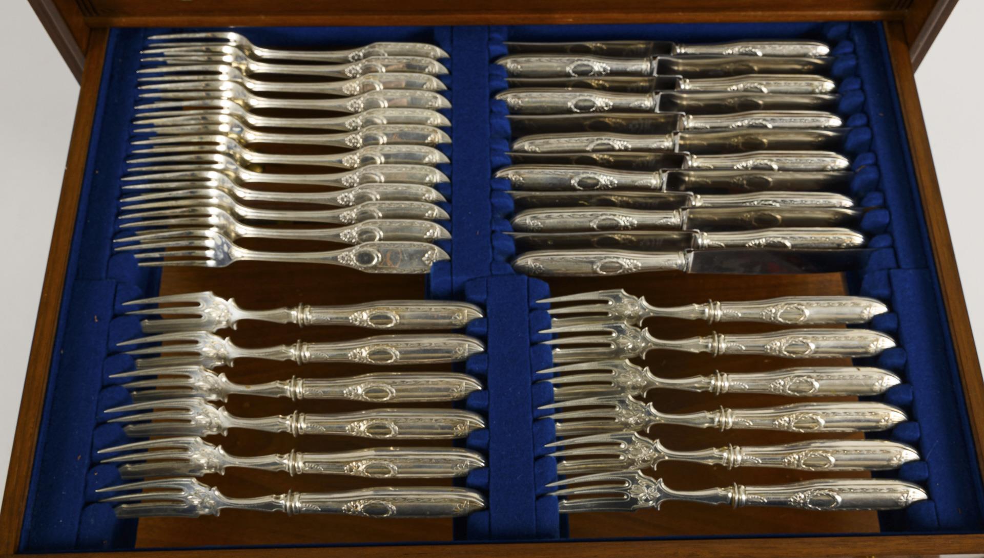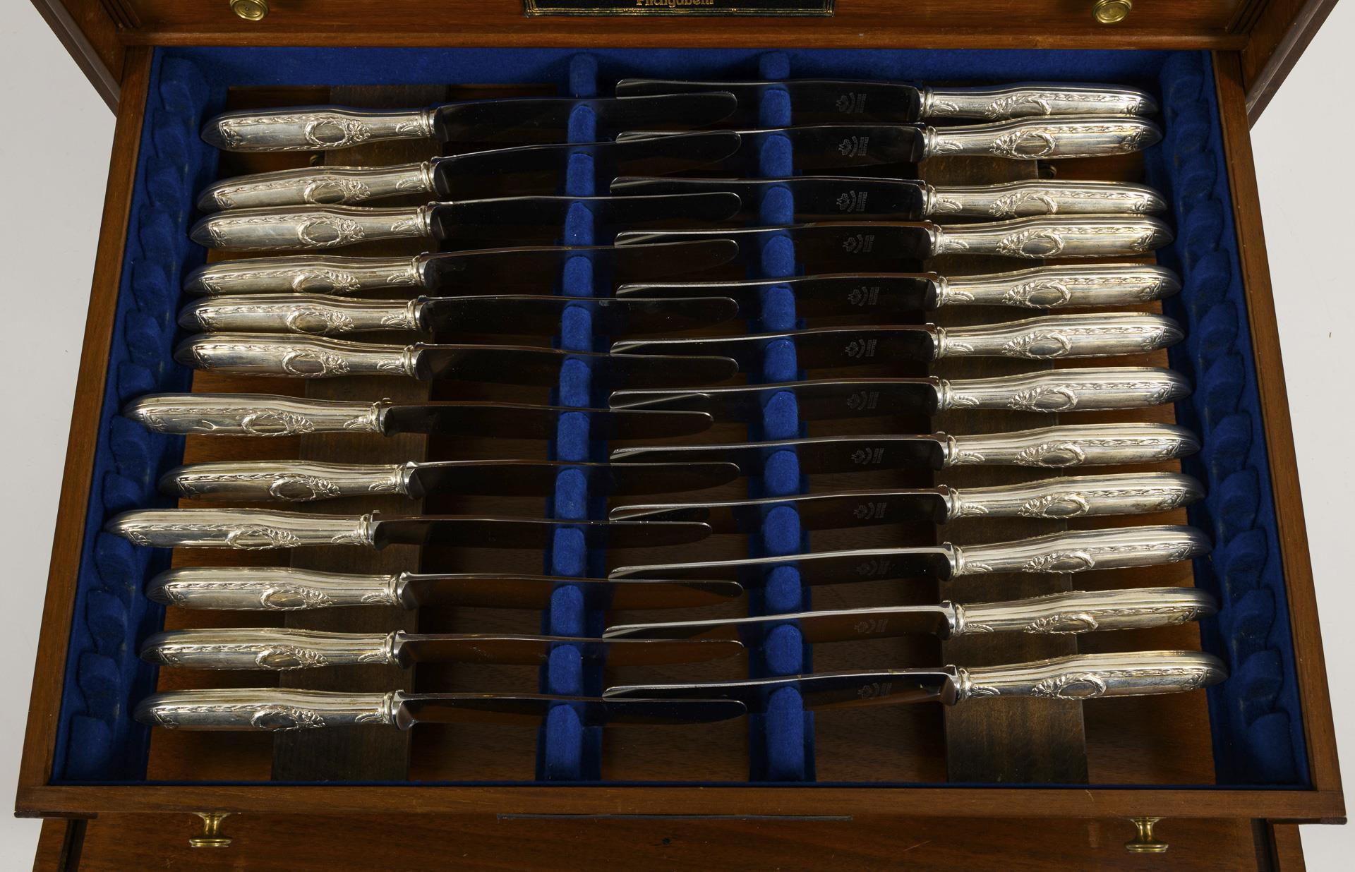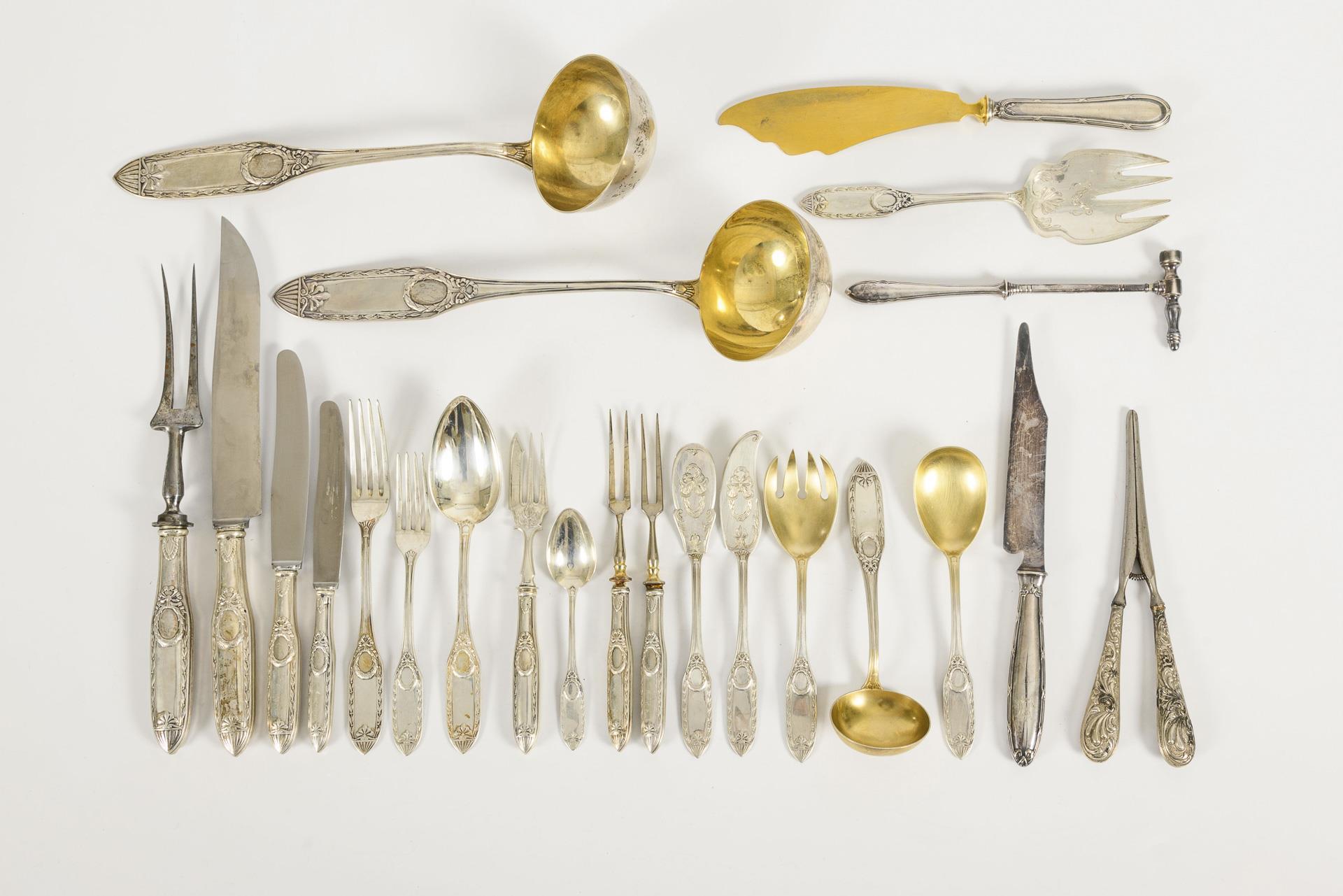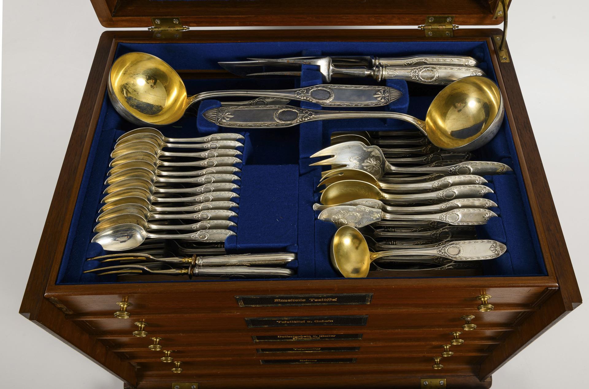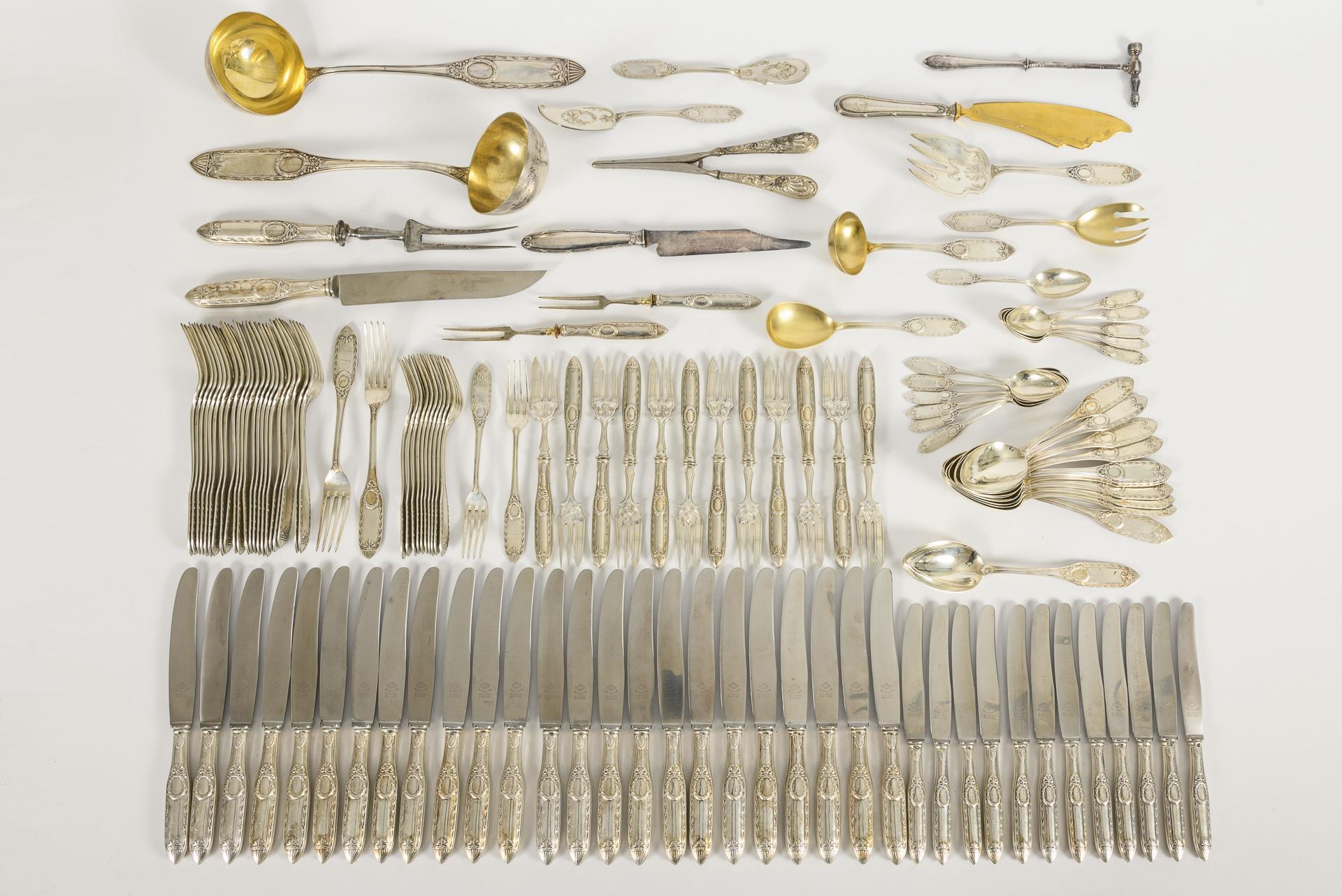 120 parts. Decor with laurel wreath reliefs. 24 dinner forks, 24 dinner knives, 12 soup spoons, 12 dessert forks, 12 dessert knives, 12 cake forks, 12 coffee spoons, 12 serving pieces. In addition, 4 serving pieces with a different pattern (partly silver-plated). Weight approx. 4400 g (without knives). Parts with signs of use, dry crack in the lid of the box.