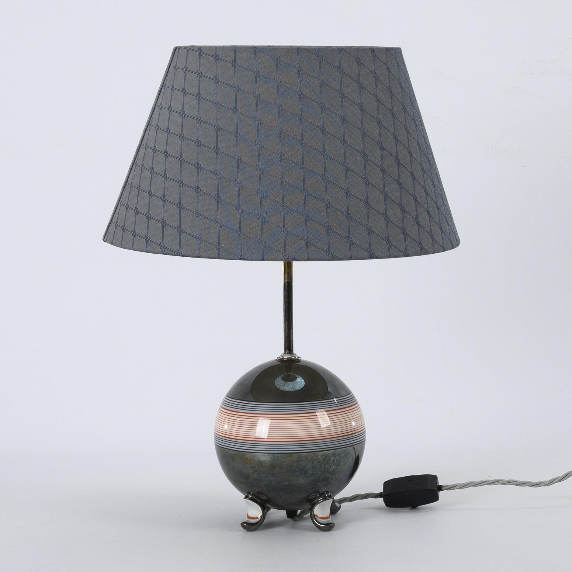 Spherical body with three feet, striped decoration and silver overlay. On the stem socket in the conical shade with blue diamond pattern. Silver plating somewhat rubbed, shade replaced, newly electrified, works.