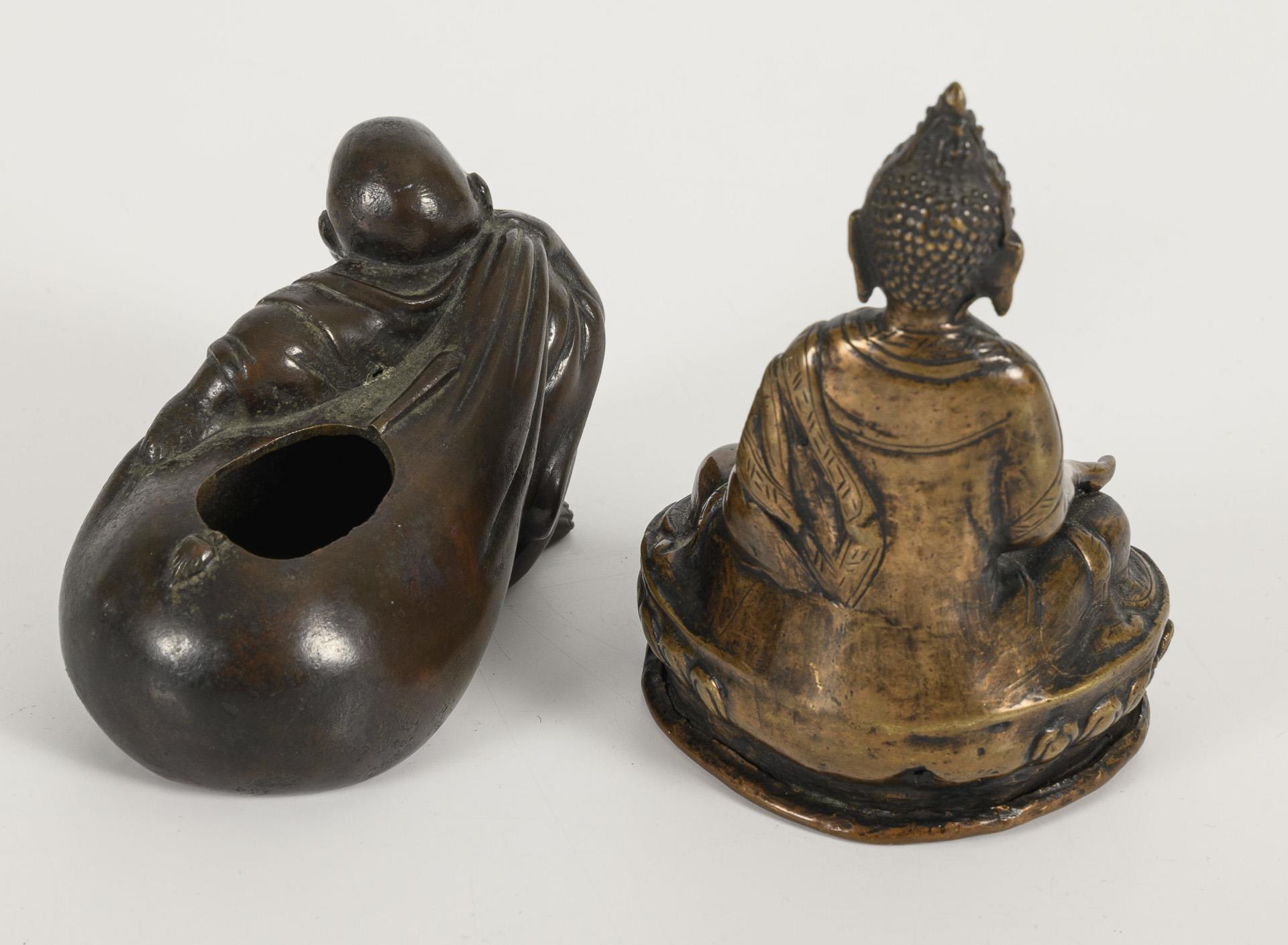 Hotei with a large sack, which he is dragging behind him. Sack worked as a small box with lid. (H 6.5 x 9 x 5 cm). / Small Buddha with the gesture of touching the ground. Finely worked, closed base. (H 11.5 cm).