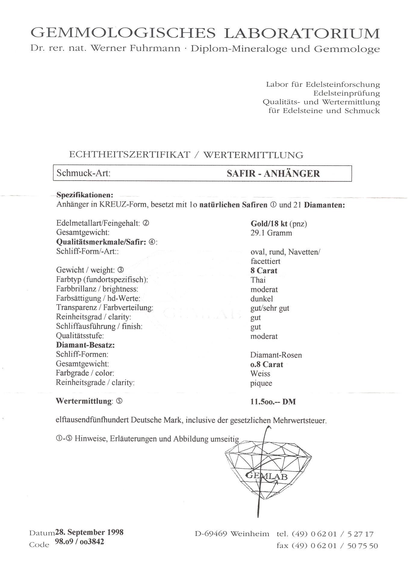Cross-shaped pendant set with 10 natural sapphires and 21 rose-cut diamonds.