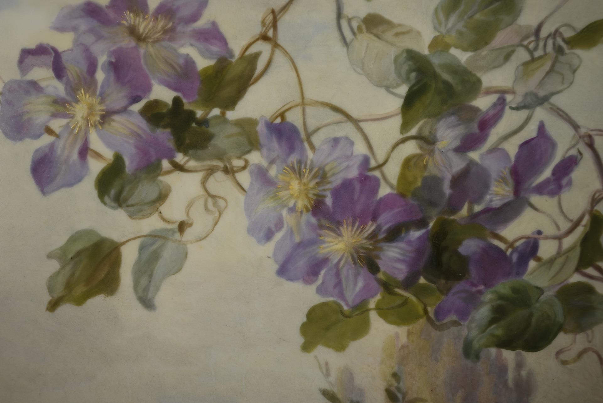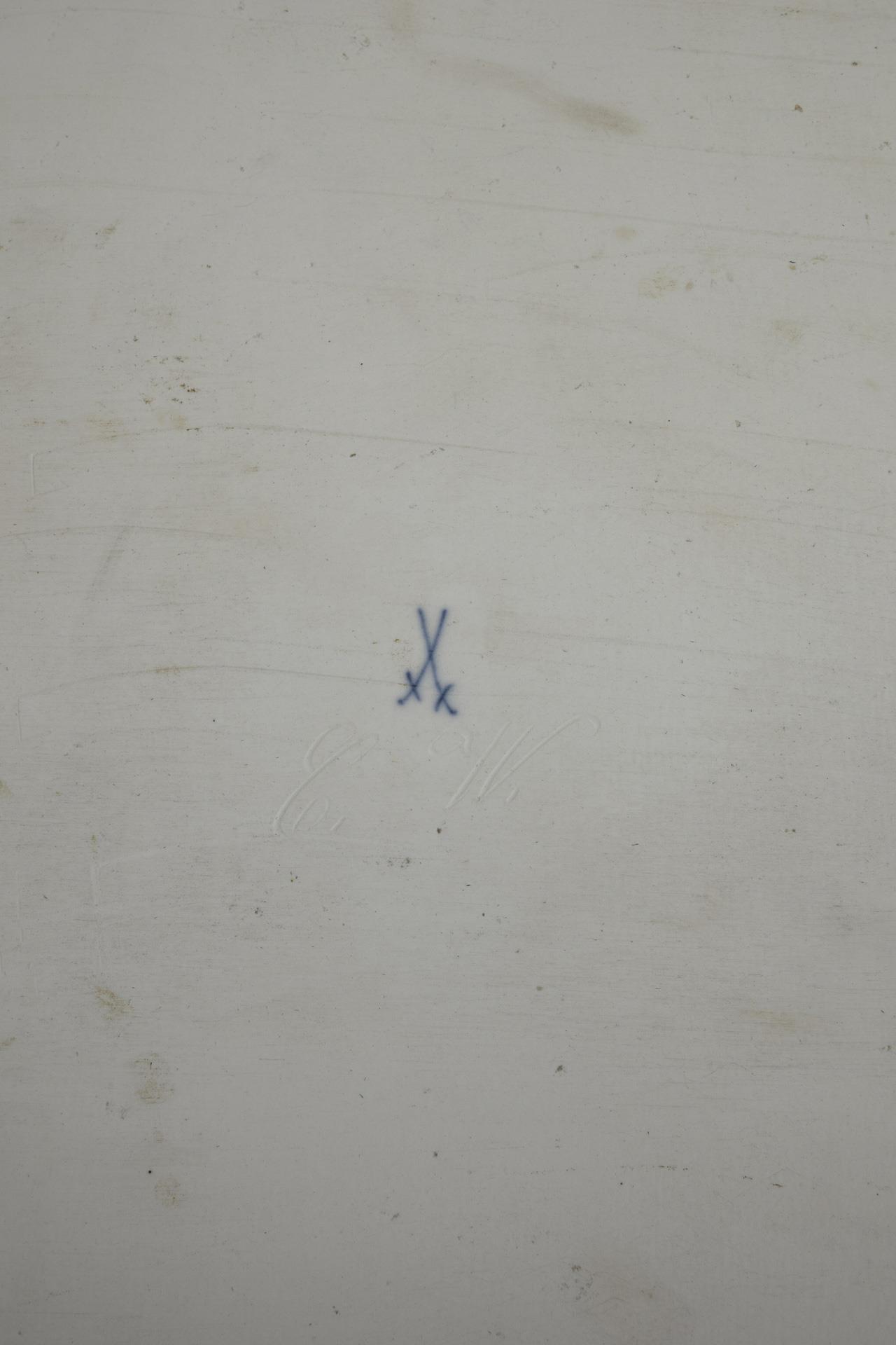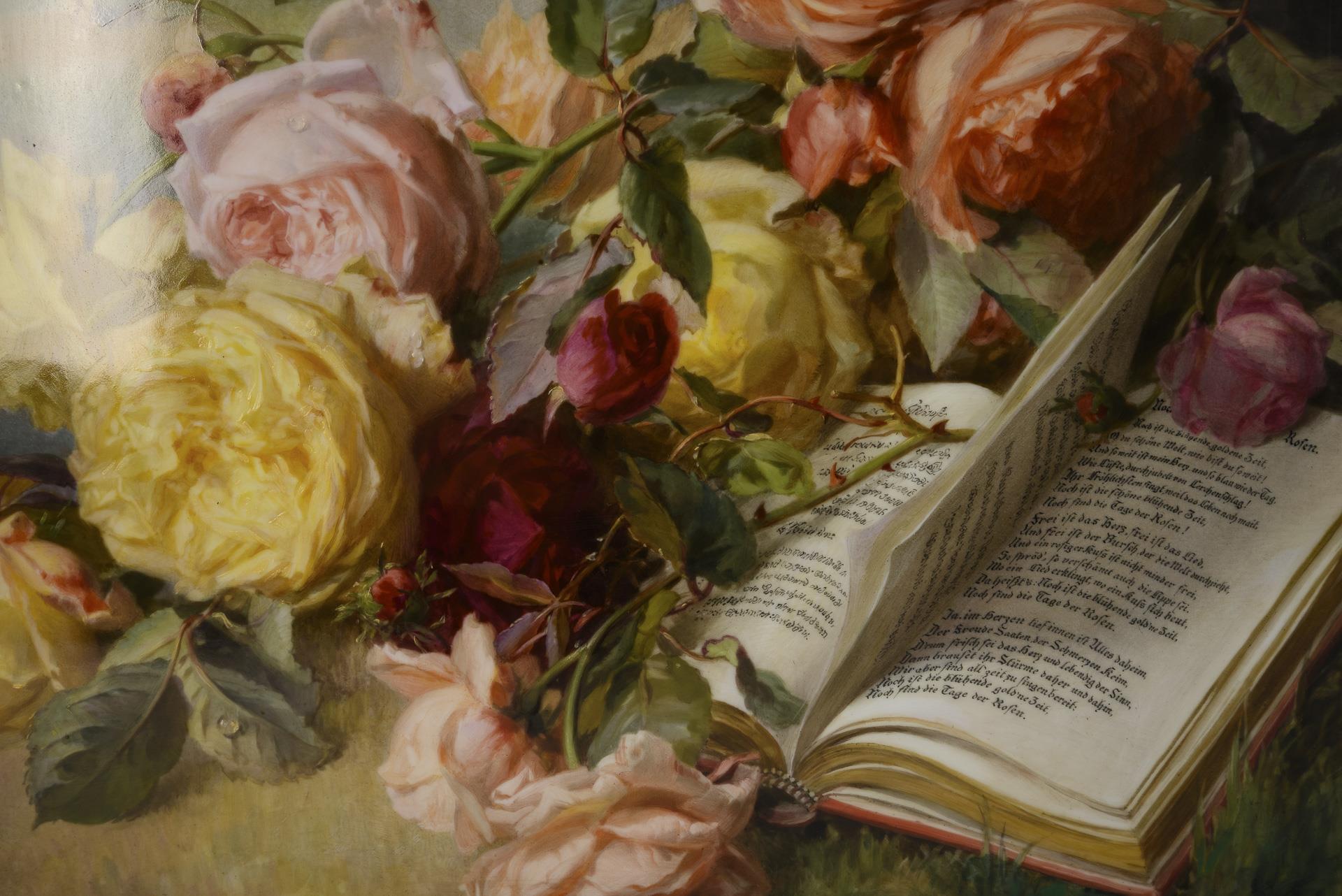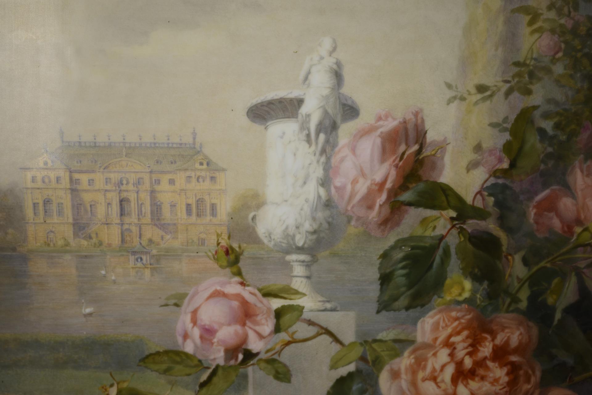 Large rectangular panel depicting a lavish bouquet of roses with an open book, in the background a view of the palace in the Great Garden in Dresden from the east with the large, so-called opulence vase by Antonio Corradini (1688-1752). In the open book the poem "Noch sind die Tage der Rosen" by Otto Roquette (1824-1896). Marked lower left corner on verso and right margin on verso.