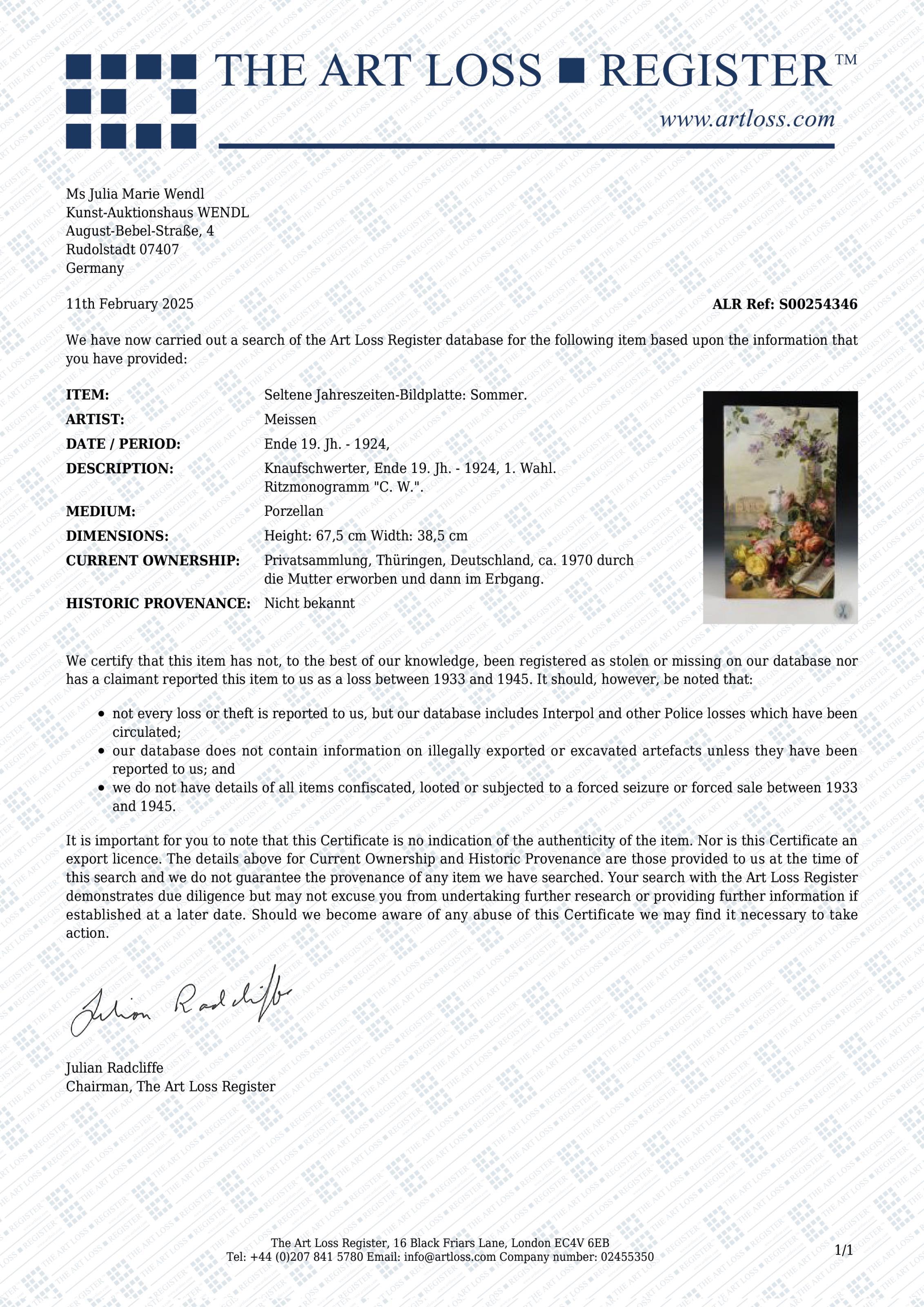 Individual examination at "The Art Loss Register" revealed no concerns regarding potentially disputed ownership claims. Certificate is available.