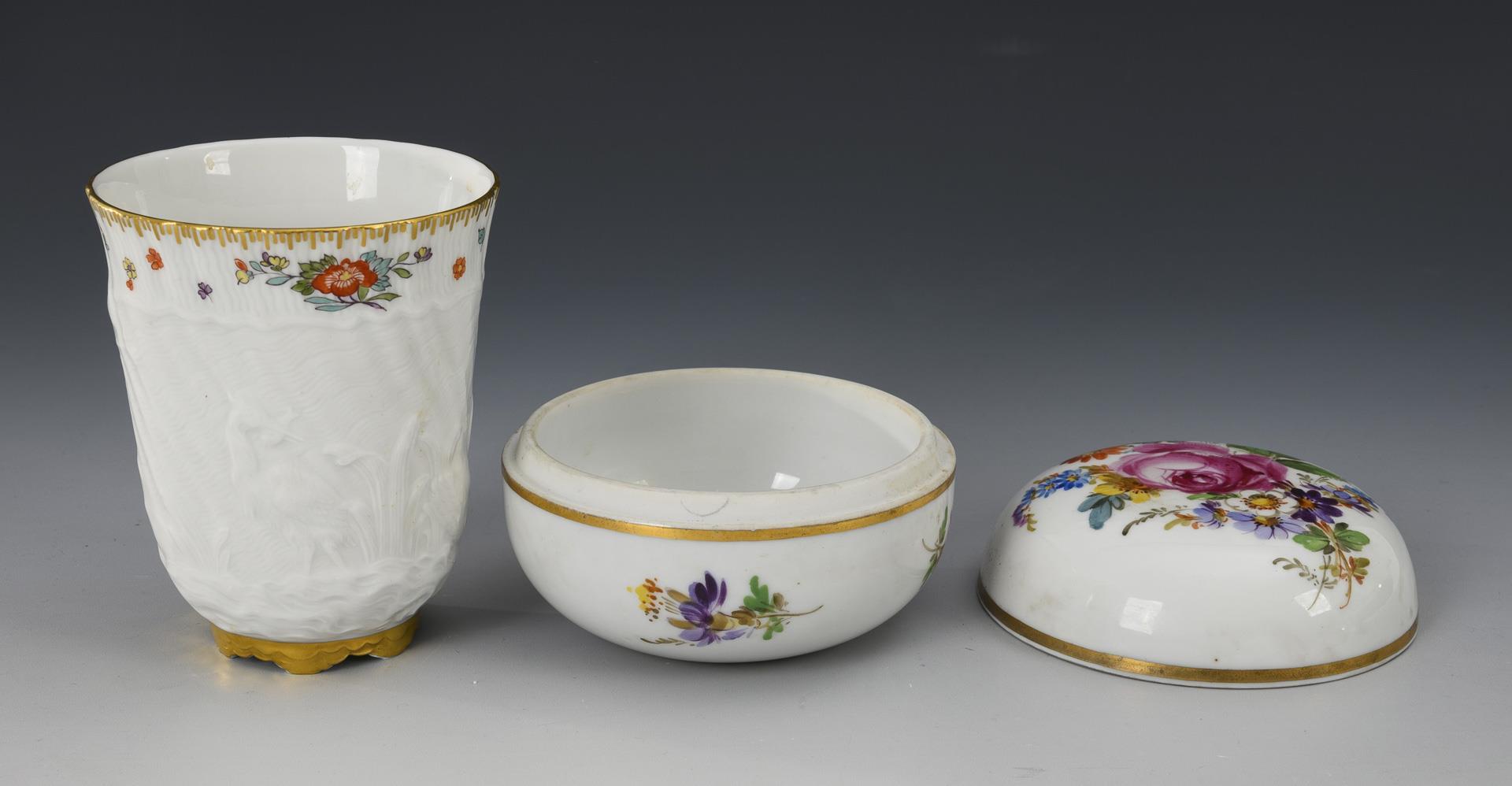 Plate (shape "Neubrandenstein"), bowl (shape "Sulkowski-Ozier"), chocolate cup with swan service decoration (h 9.5 cm), box, 3 mocha saucers, ashtray. One saucer with hairline crack, partial gold abrasion.