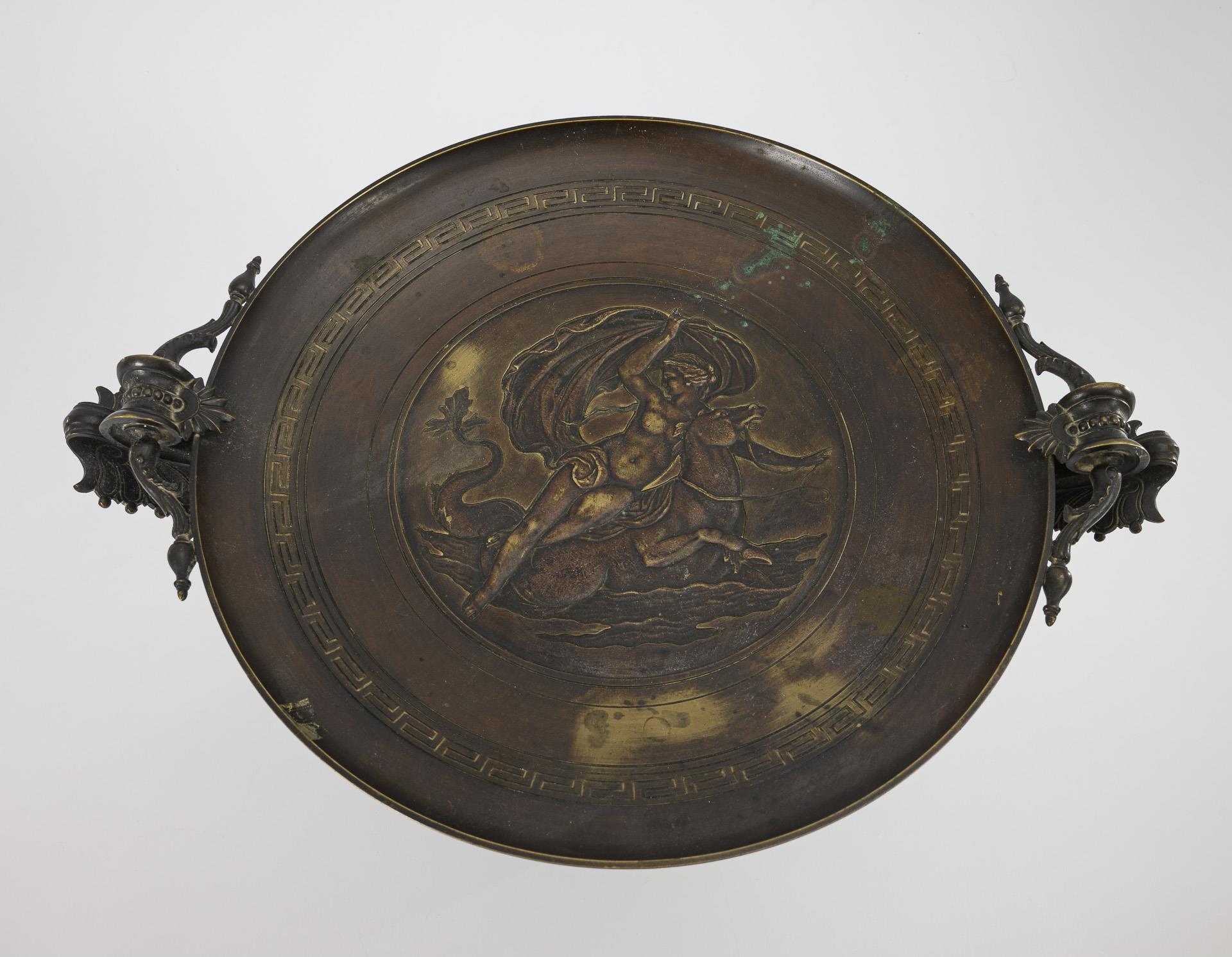 Shaft in the form of a fully sculpted bust of the sea god Neptune; bowl with palmettes on the volute handles. Sunk relief in the bowl with Amphitrite on a hippocamp and meander framing. Patina rubbed, stained with "verdigris" in the bowl.