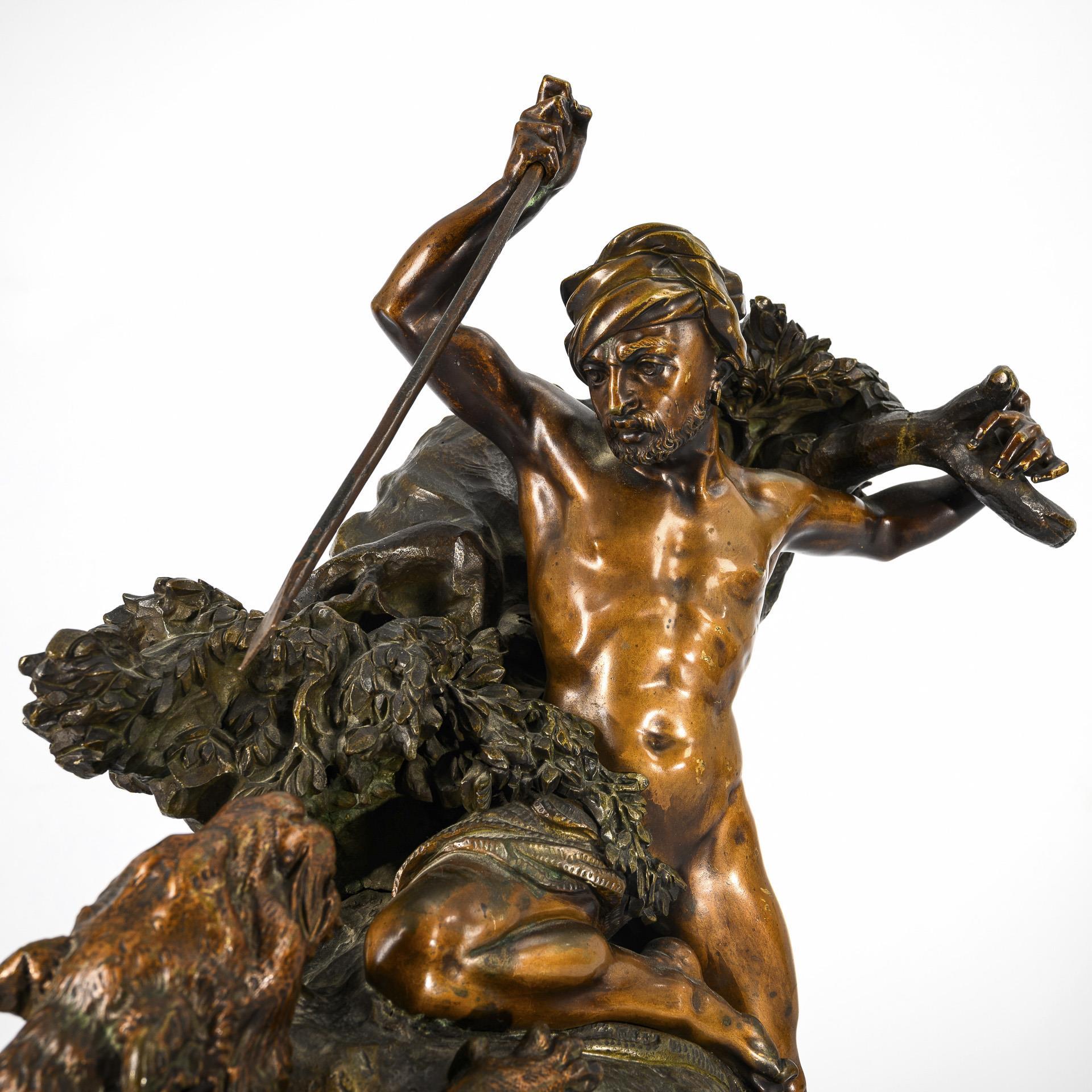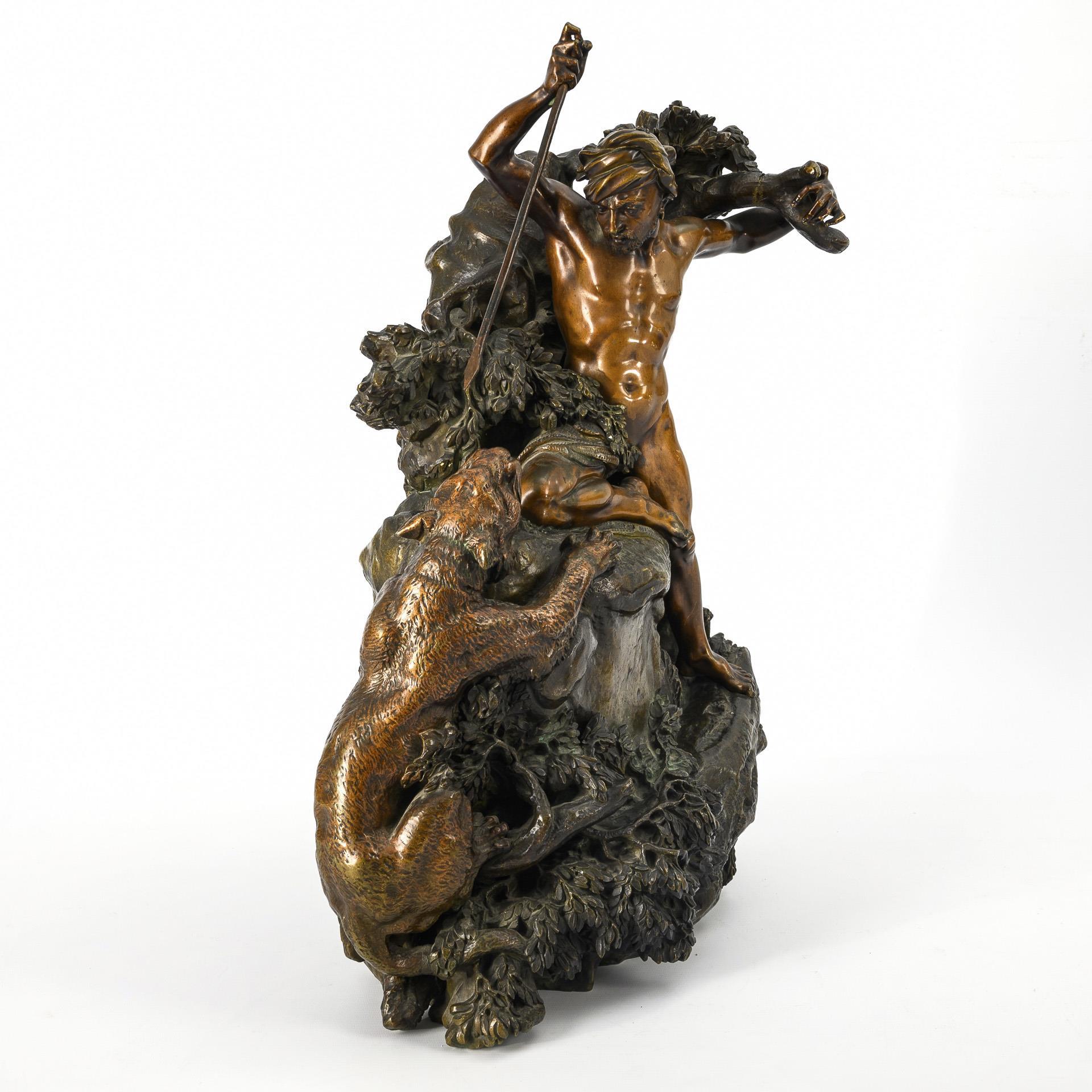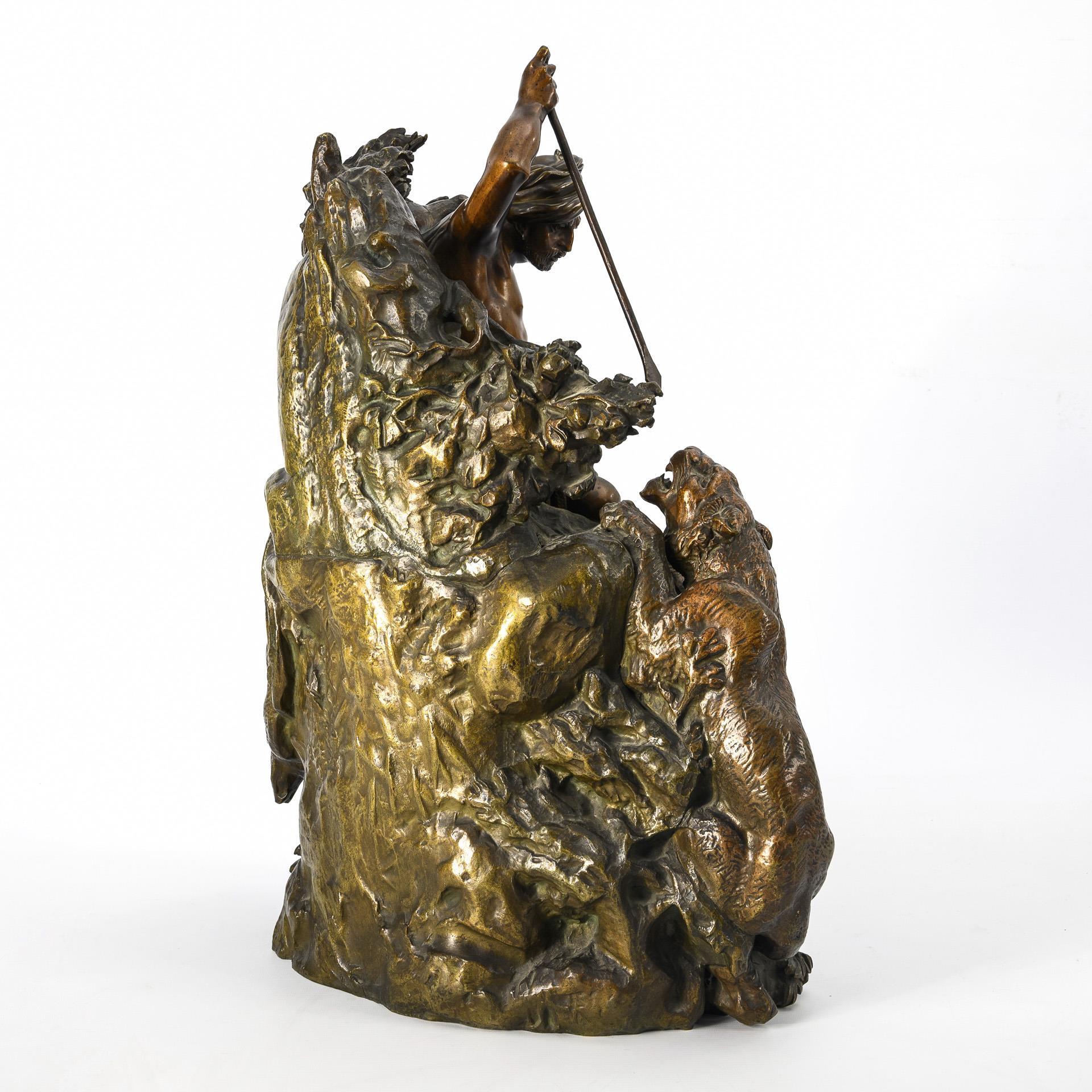 Dramatic fight between the naked Oriental and the wild cat. On the overgrown hillside, half kneeling man with turban, raising his lance against the climbing cat of prey. Branch broken near the hand, part of the lance missing, incarnate rubbed.