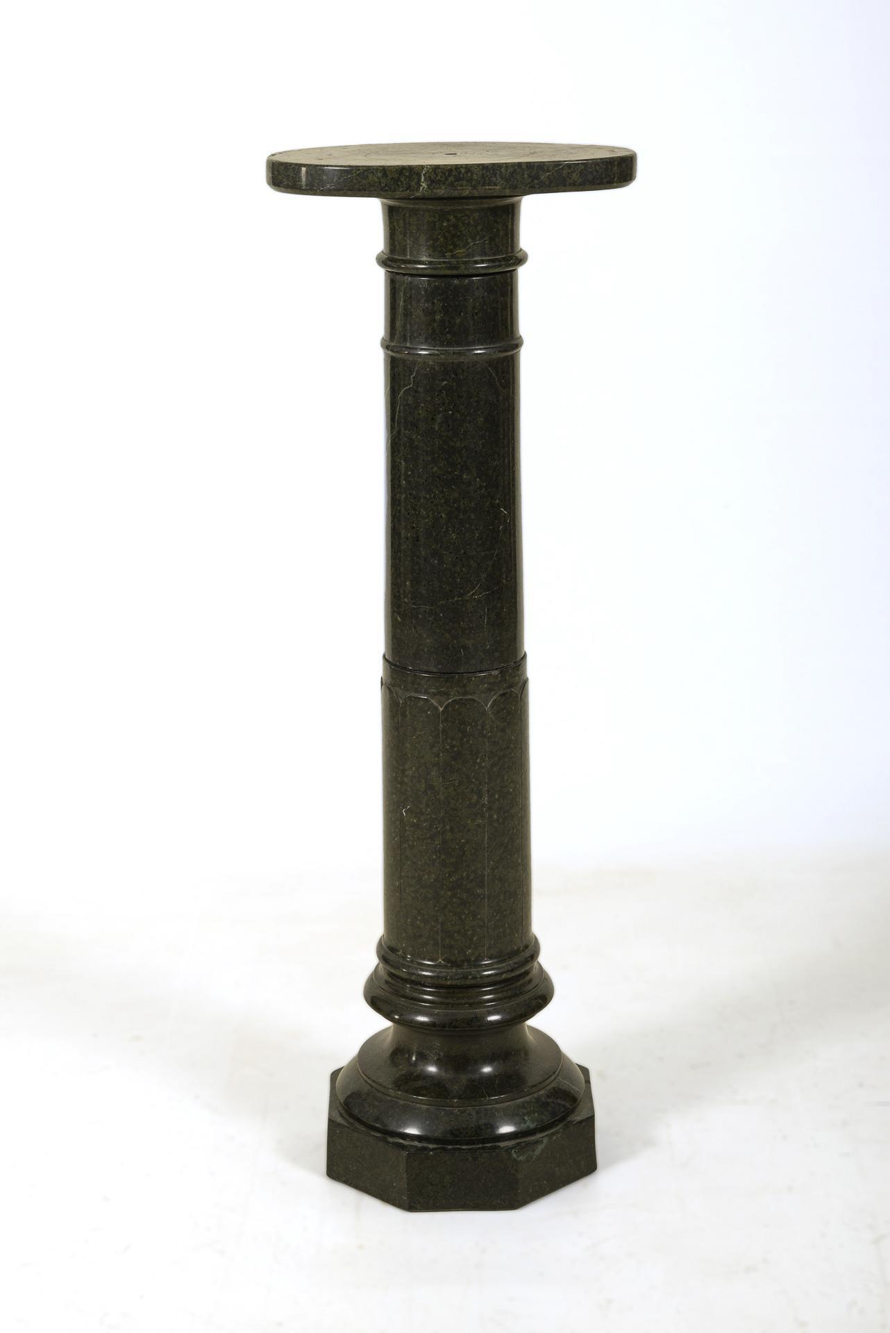 4-part. Attic base with octagonal base, 2-part shaft with flat pipes and neck ring, pivoted capital in almost Tuscan form with oval "abacus". Oval plate glued with minor repairs, minor chipping to the base.