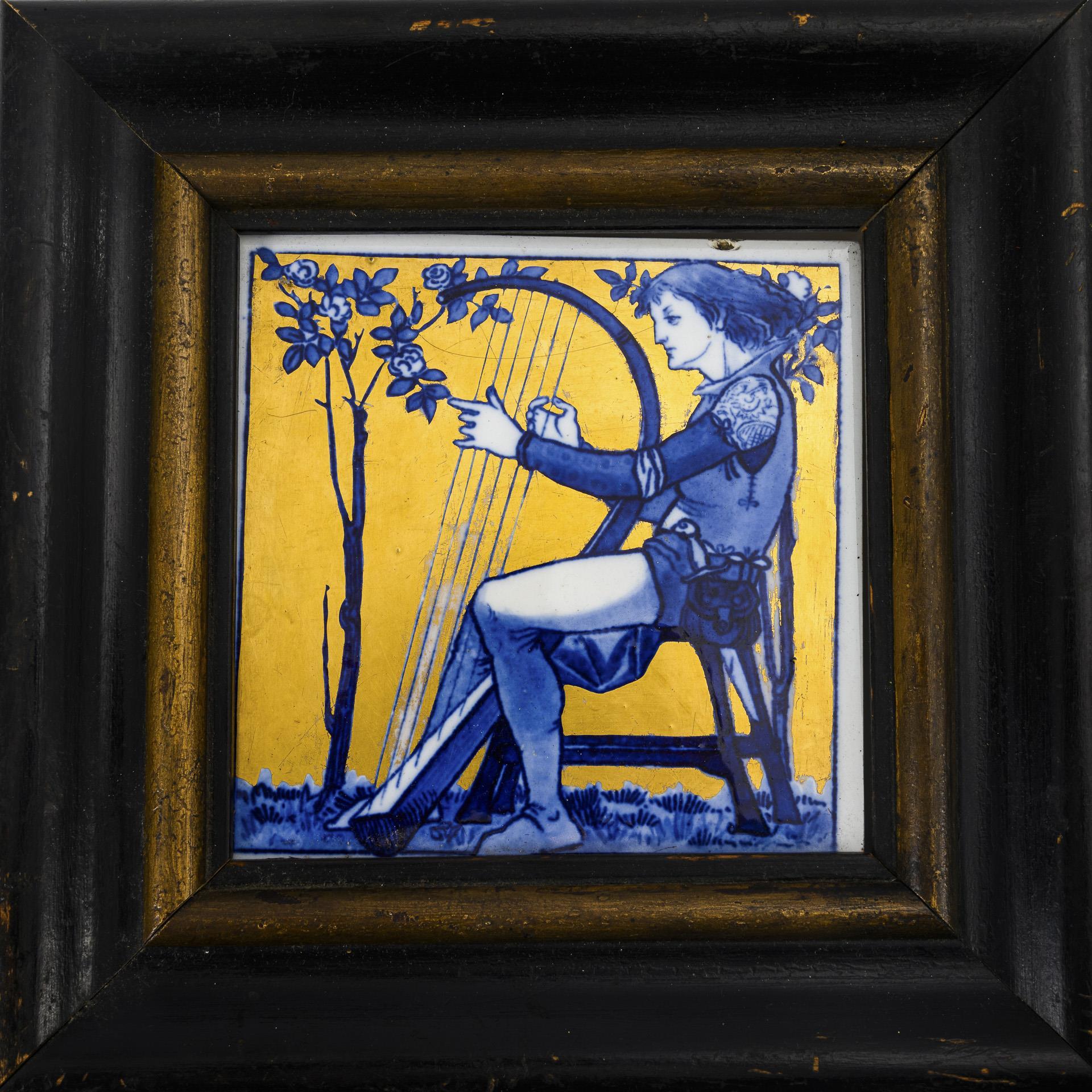 16 tiles with thread relief decoration, various floral and ornamental motifs, 3x with birds. Including 1 tile painting: a lyre-playing Jüngling in blue against a gold background, in a dark wooden frame. Partially small defects.
