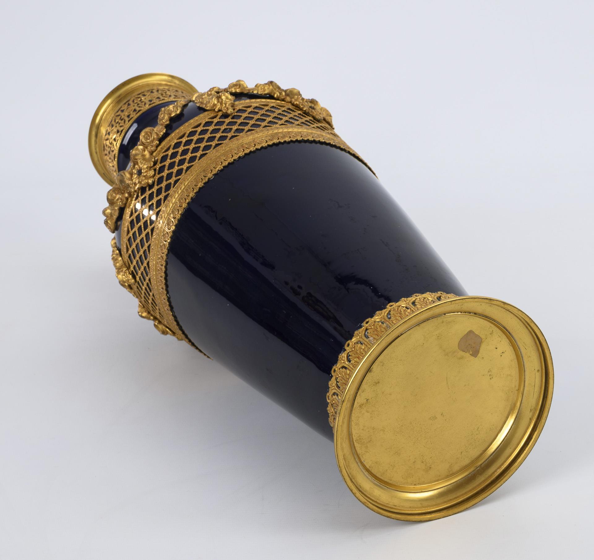 Large cobalt fond vase with bronze mounting.