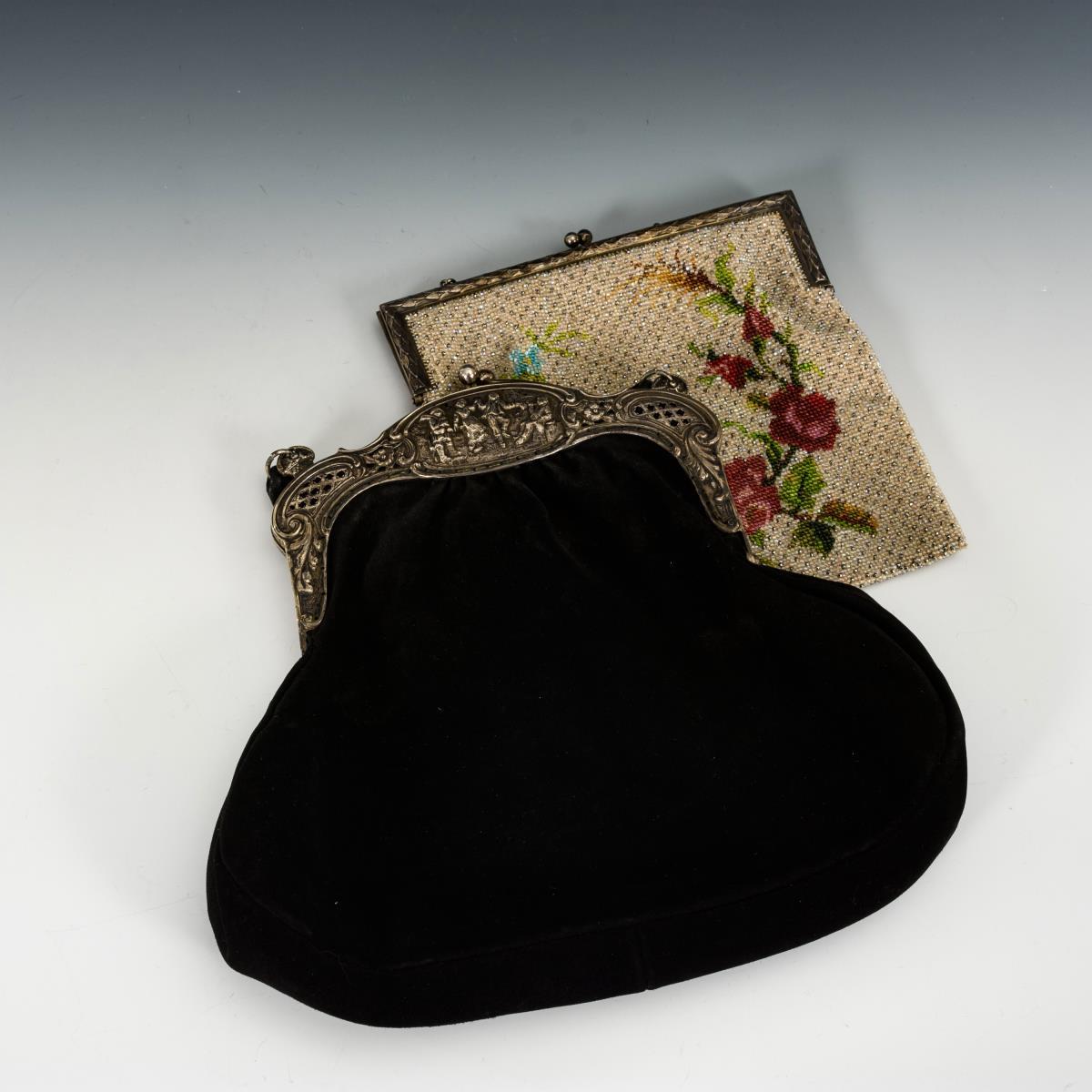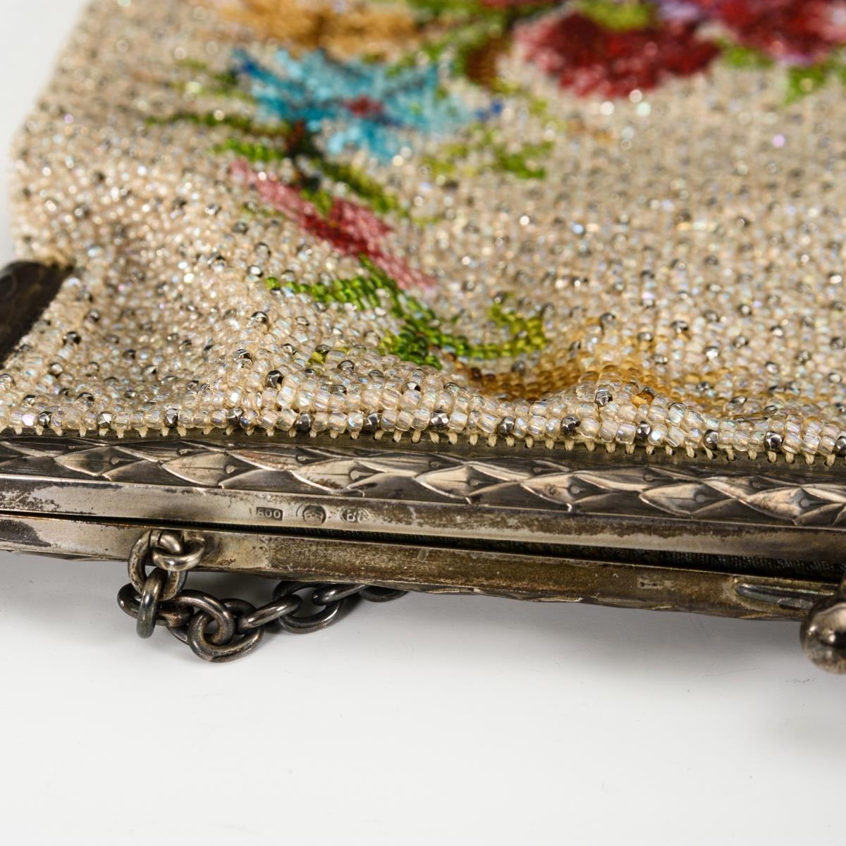 Silberbügel, schwarzes Wildleder, Perlstickerei.