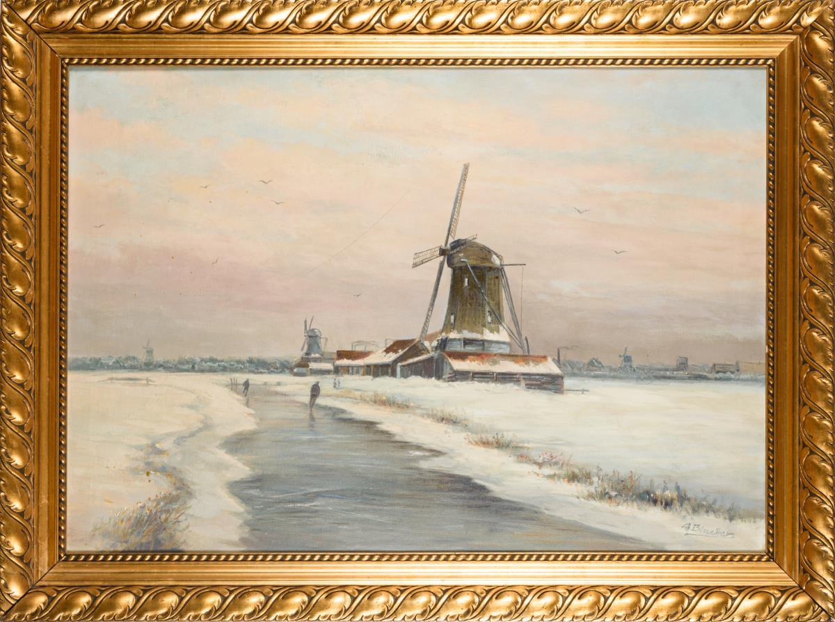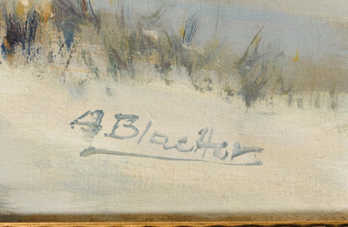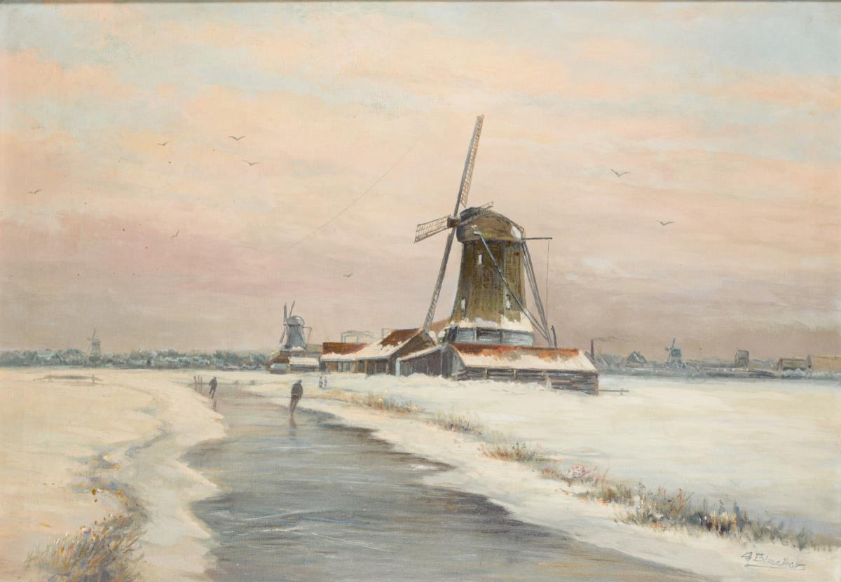 Blaetter, Albert: Winterlandschaft mit Eisläufern. Öl/Leinwand, rechts unten