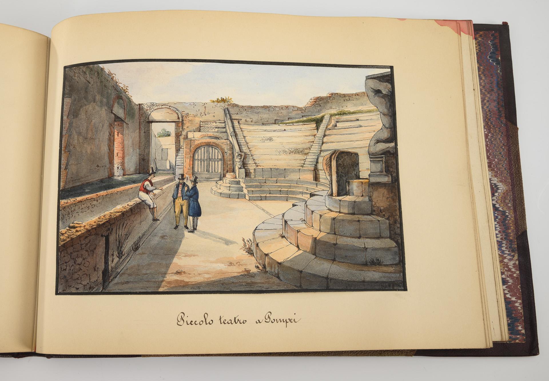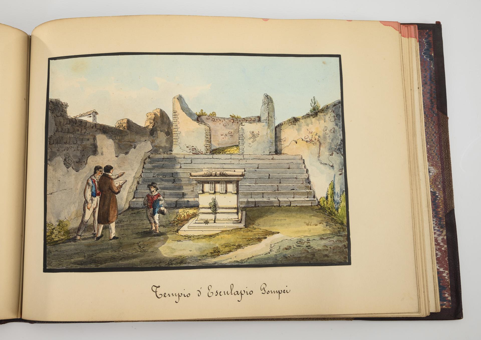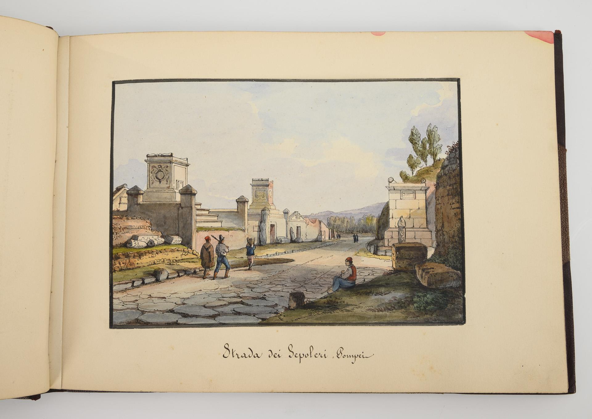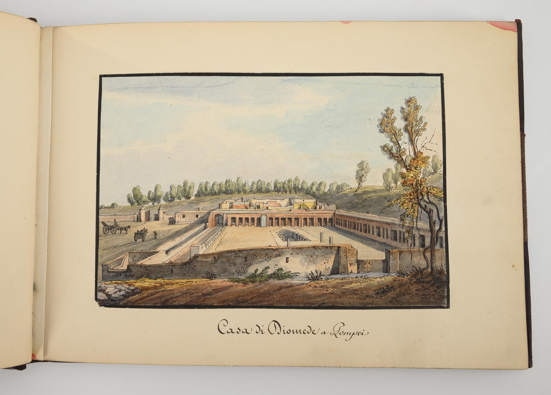 Collection of high-quality watercolors from the early period of the excavations in Pompeii and Herculaneum. Depicted are, among others, the Villa of Diomedes, the gate of Herculaneum, the Panteon of Pompeii, the Temple of Fortuna in Pompeii or the great theater of Pompeii.