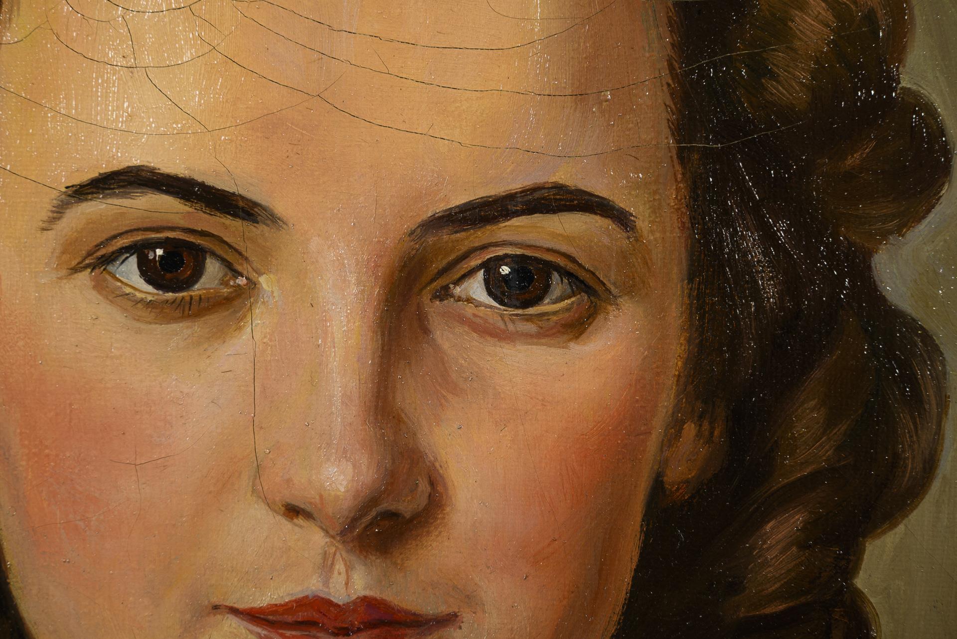 Portrait of a young woman in a light blue dress with brown curled hair. Slight traces of age.
