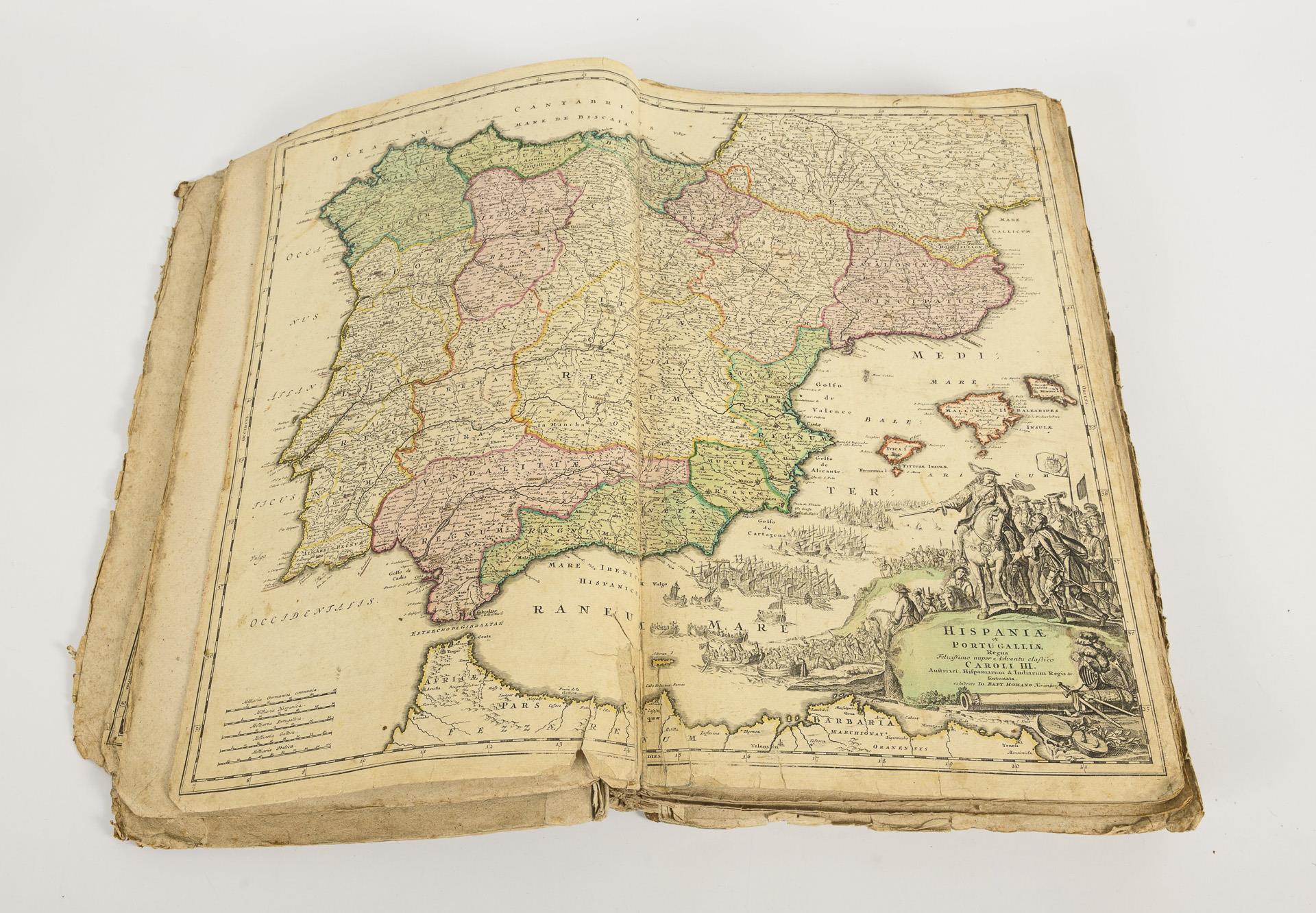 Globe / Aegyptus Hodierna / Cataloniae / Aquitaniae / Ducatus Britanniae - de Bretagne / Magna Britannia / Regnum Anglia / Regnium Scottiae / Belgio ... Catholicae / Ducatus Luxemburgi / Comitatus Flandriae / Ducatus Brabantiae / Belgii ... Hollandia / Helvetiorum / Italiae / Imperium Romano-Germanicum / Archiducatus Austriae / Ducatus Carnioliae ... et Histriae (Carniola) / Tirolis / Circulus Franconicus (Seutter) / Bavariae / Circuli Sveviae (Swabia) / Rhenanus Inferior / DerRhein, Maas and Moselle / Circuli Westphaliae / Rheni Superioris Mosae et Mosellae(Dancker) / Rheni Inferioris Mosae et Mosellae (Dancker) / Saxoniae Inferioris Circulus (Seutter)/ Circulus Saxoniae Inferioris / Ducatus Mecklenburgici (Seutter) / Saxony (as two-arched, half map) / Ducatus Pomeraniae / Moravia (Seutter) / Regni Daniae / Iutiae - Jutland / Insulae Danicae / Scandinavia / Regni Poloniae / Turcicarum et Tartaricum (Seutter) / Danubii ... Graeciae / Imperii Moscovitici pars Septentrionalis (Seutter) / Imperiii Moscovitici pars Australis (Seutter) / Ukrania / Terra Sancta. Also includes title page with table of contents and some maps of the "Kleiner Atlas Scholasticus" by Johann Baptist Homann. However, 5 maps of this are probably missing. Binding preserved in fragment, signs of age and wear. Maps in varying condition. Edges bumped, but otherwise mostly in good order.