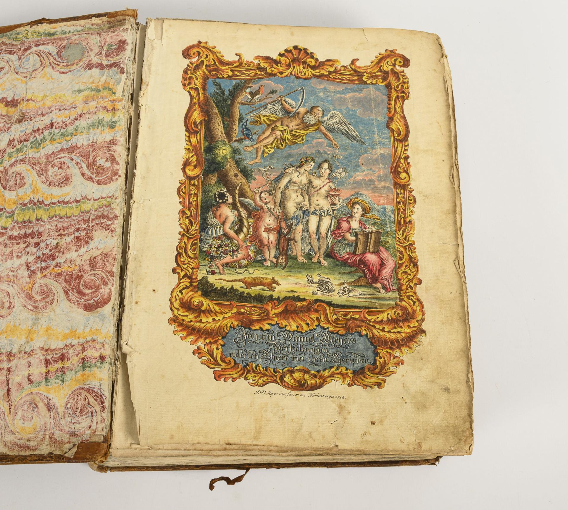 3 parts in one book. Colored title copperplate (somewhat torn), title, Meyers copperplate with large missing part, (4), 56 (partly loose), (2) index pages, 100 coloured engraved leaves, title copperplate, title, 28, (2) pages, 100 colored engraved leaves / title page (3rd part), (2), 10 pages, 36 of 40 colored engraved leaves. Exact collation on request. Leather binding with strong traces of use, spine rubbed and torn. Magnificent volume with 240 colored copper plates depicting various animals (birds, mammals, fish and reptiles) in nature and as skeletons. The leaves are labeled. Here is a much-used, but almost complete copy of the very rare edition, which was already an expensive pleasure at the time of publication.