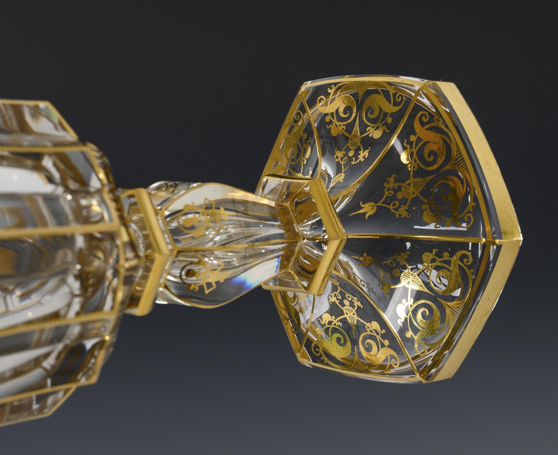 Bell-shaped bowl with notched rim, faceted baluster stem, hexagonal foot.