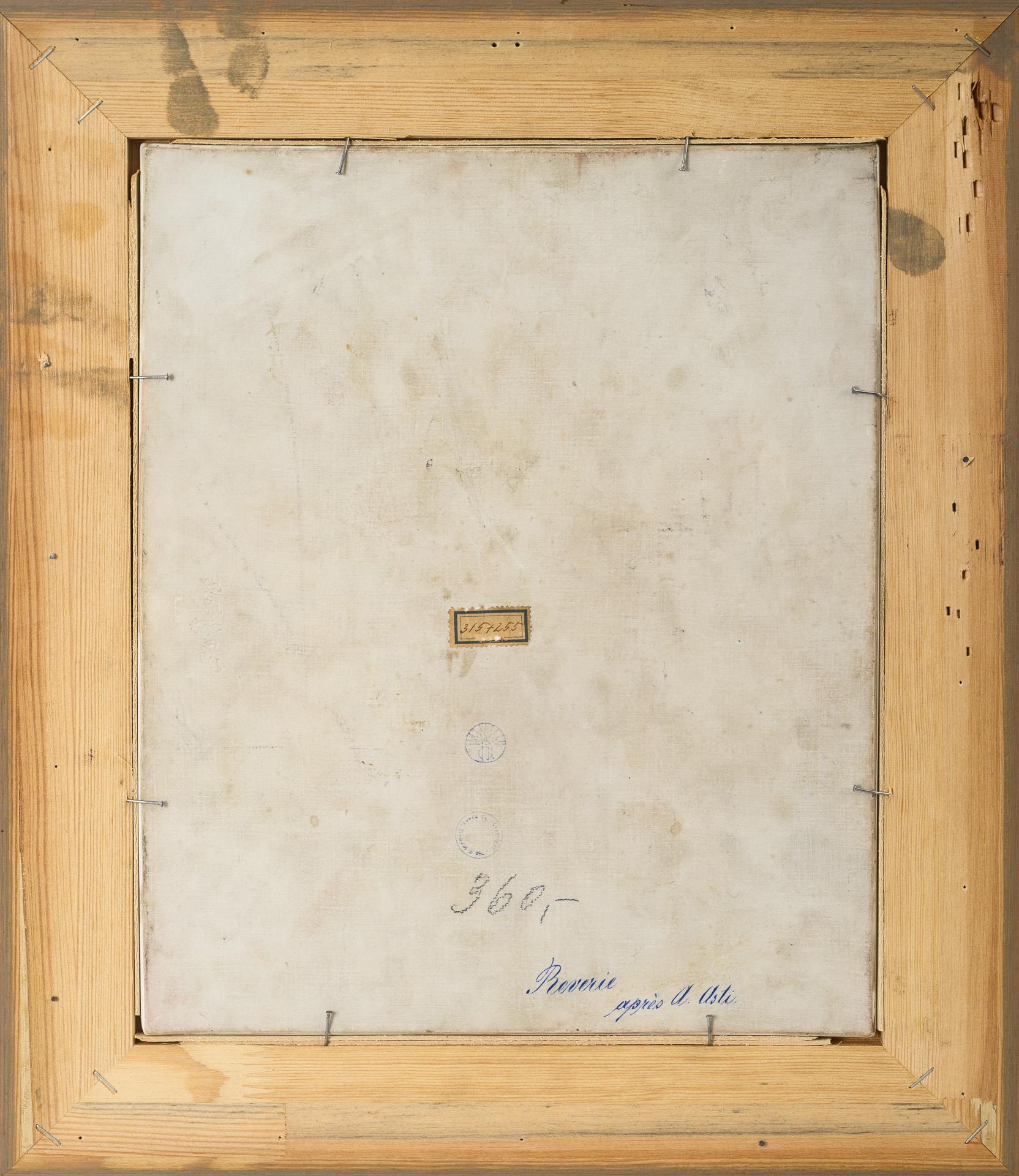 Rectangular panel with the portrait of a young lady with flowing hair, after a painting by Angelo Asti (1847-1903), verso inscribed "Reverie aprés A. Asti".