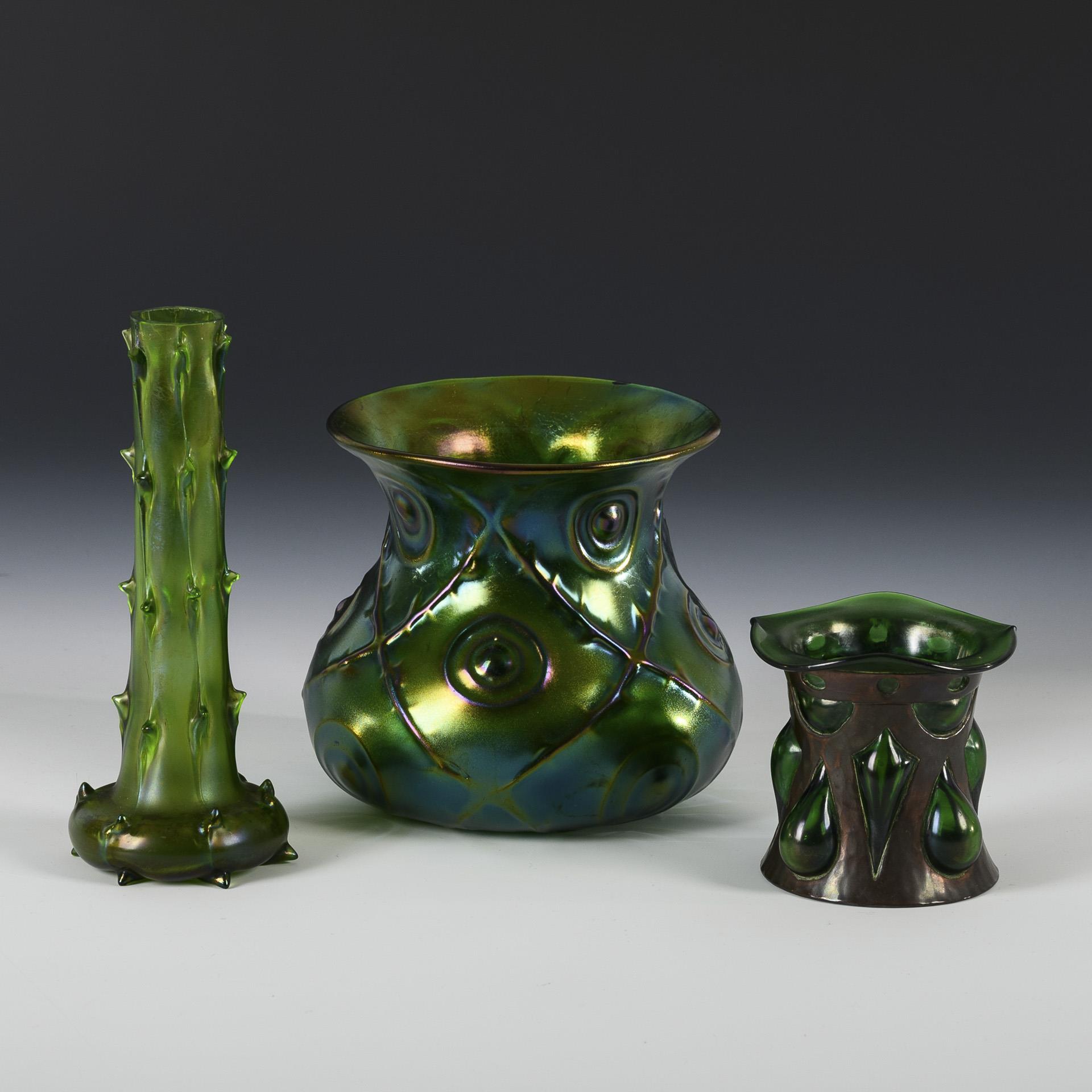 1x krater vase with humped wall and galvanized copper overlay (this hallmarked "COBRAL REG. D WARE"; h 8.5 cm). / 1x optically shaped blown vase with bulging body and crater neck (h 14 cm). / 1x narrow-necked vase with pressed stand and applied threads with pointed spouts (h 18.5 cm). All with spherical pontil marks. 3 nubs chipped.