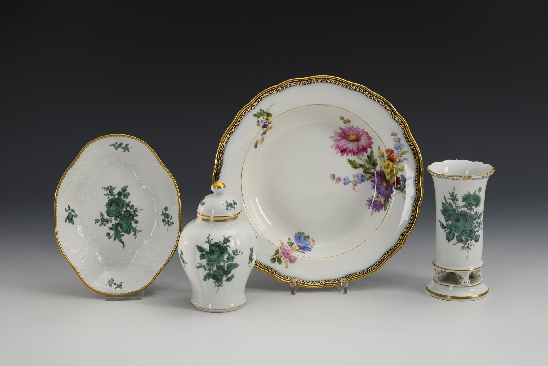 3x with copper-green flower painting: pedestal vase (H 14.5 cm), tea caddy (H 13.5 cm) and quatrefoil bowl (L 18 cm). / 1 soup plate with cobalt blue rim and polychrome flower painting (Ø 23.5 cm). Hairline spider in the plate.