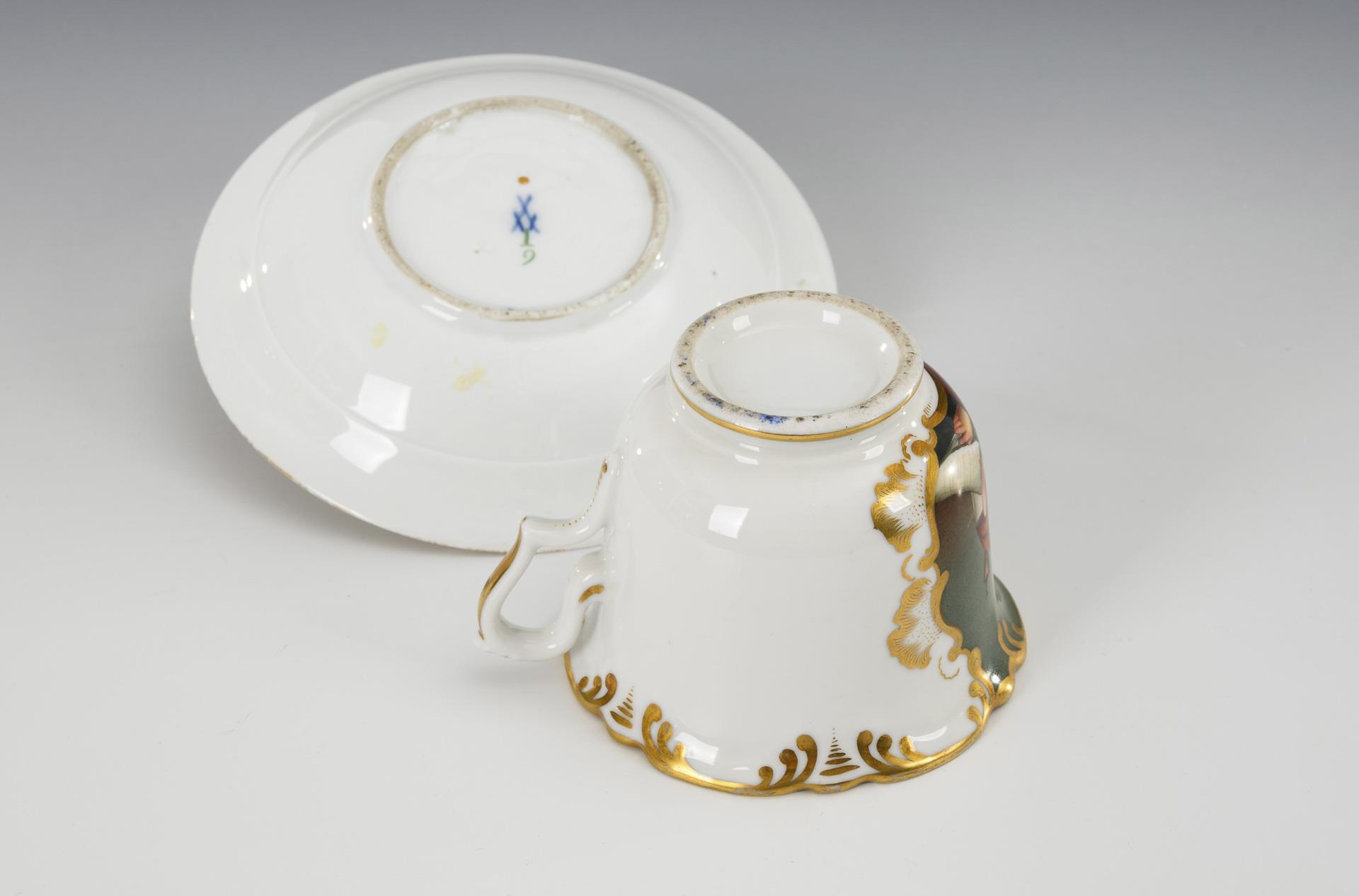 Bell cup with the depiction of St. John the Evangelist in a cartouche framed in gold rocaille. Saucer gold somewhat rubbed.
