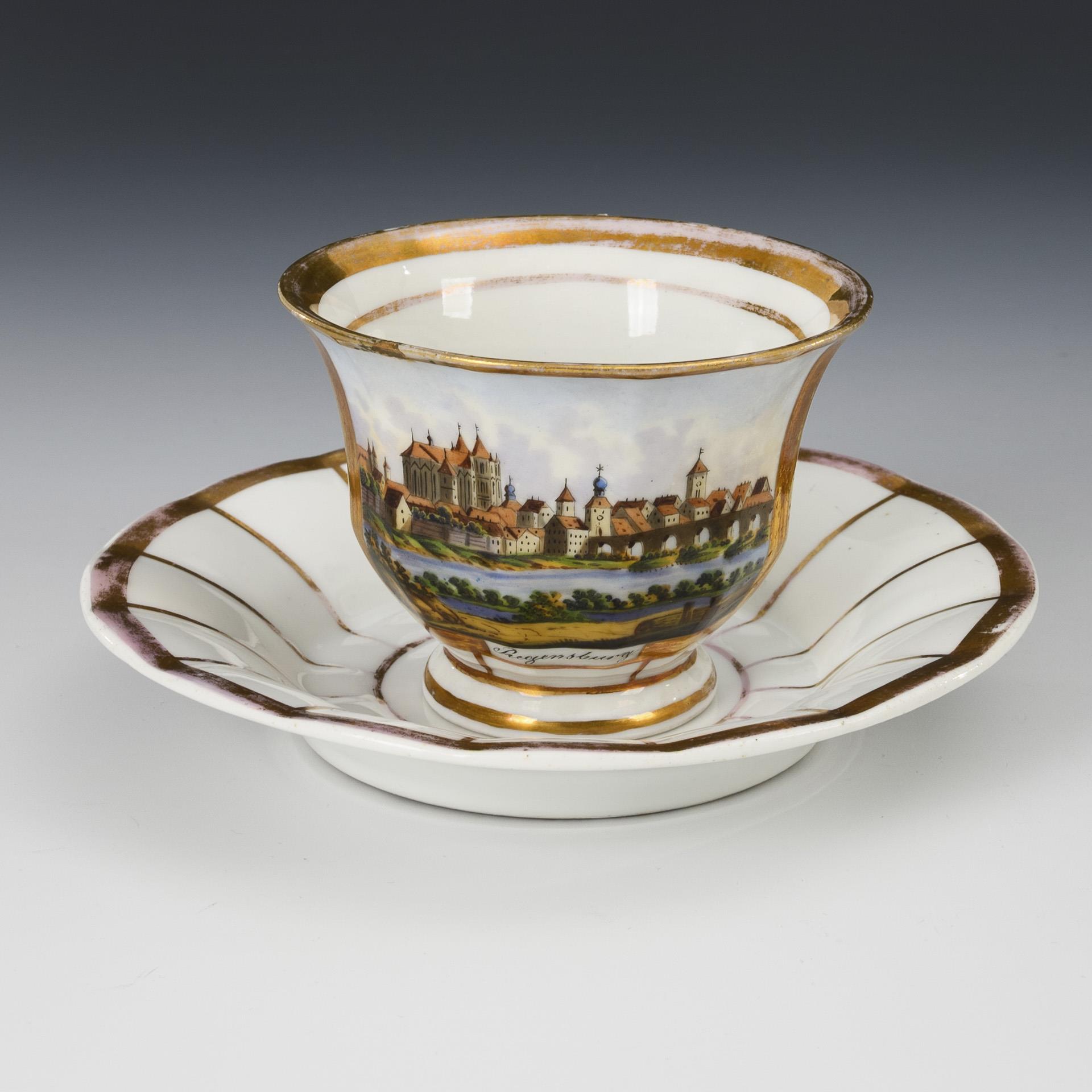 Filled, polygonal bell-shaped cup with tapered handle. On the front a gold-framed rectangular cartouche with the inscribed view of the city of Regensburg with a view of the cathedral. Gold rubbed, gold retouch on the rim of the cup.