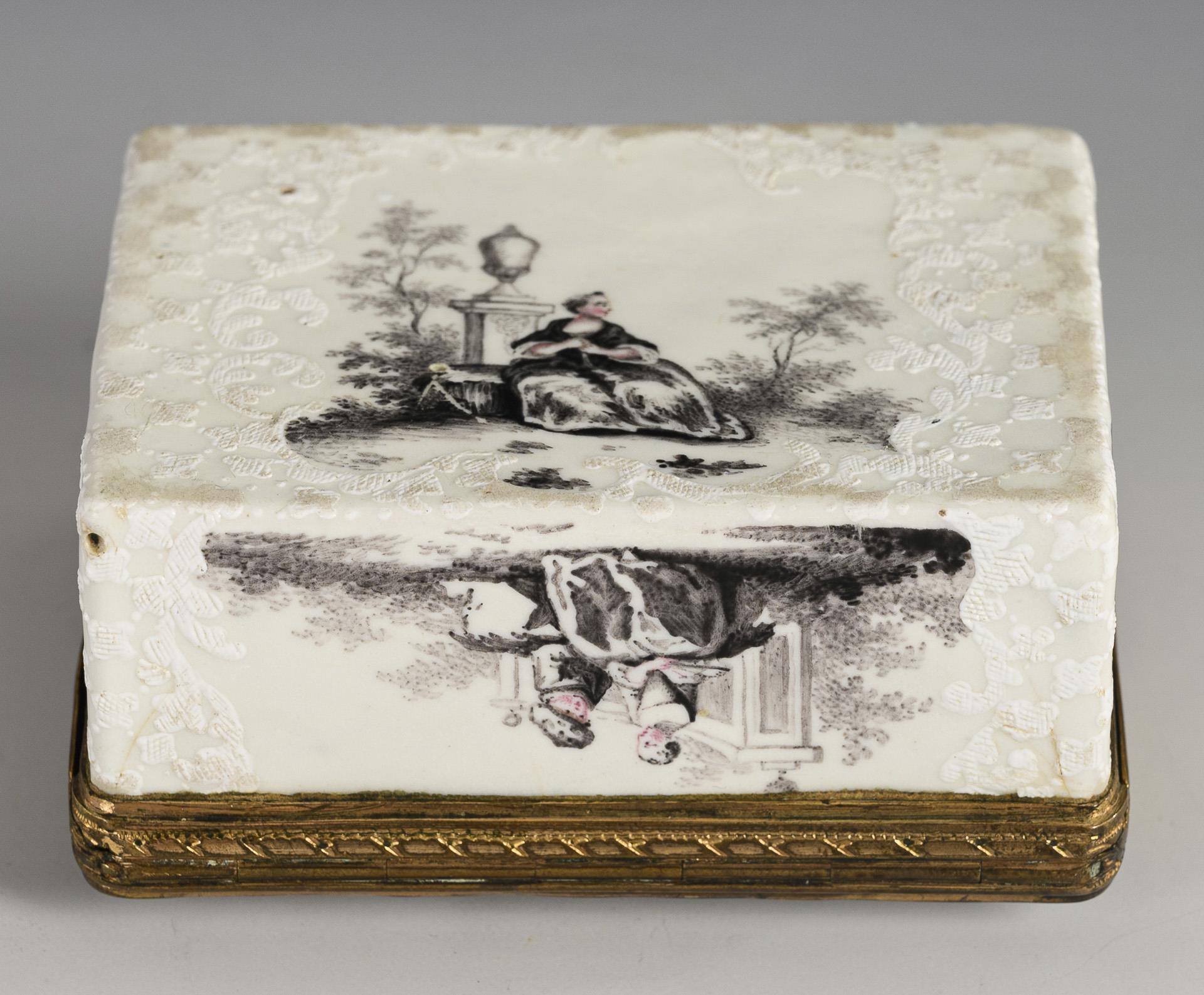 Cuboid box with slightly cambered hinged lid and decorated mounting. On and in the lid, on all sides and on the base gallant scenes; each in ornamental relief framing. Some hairline cracks, mostly in the lid.