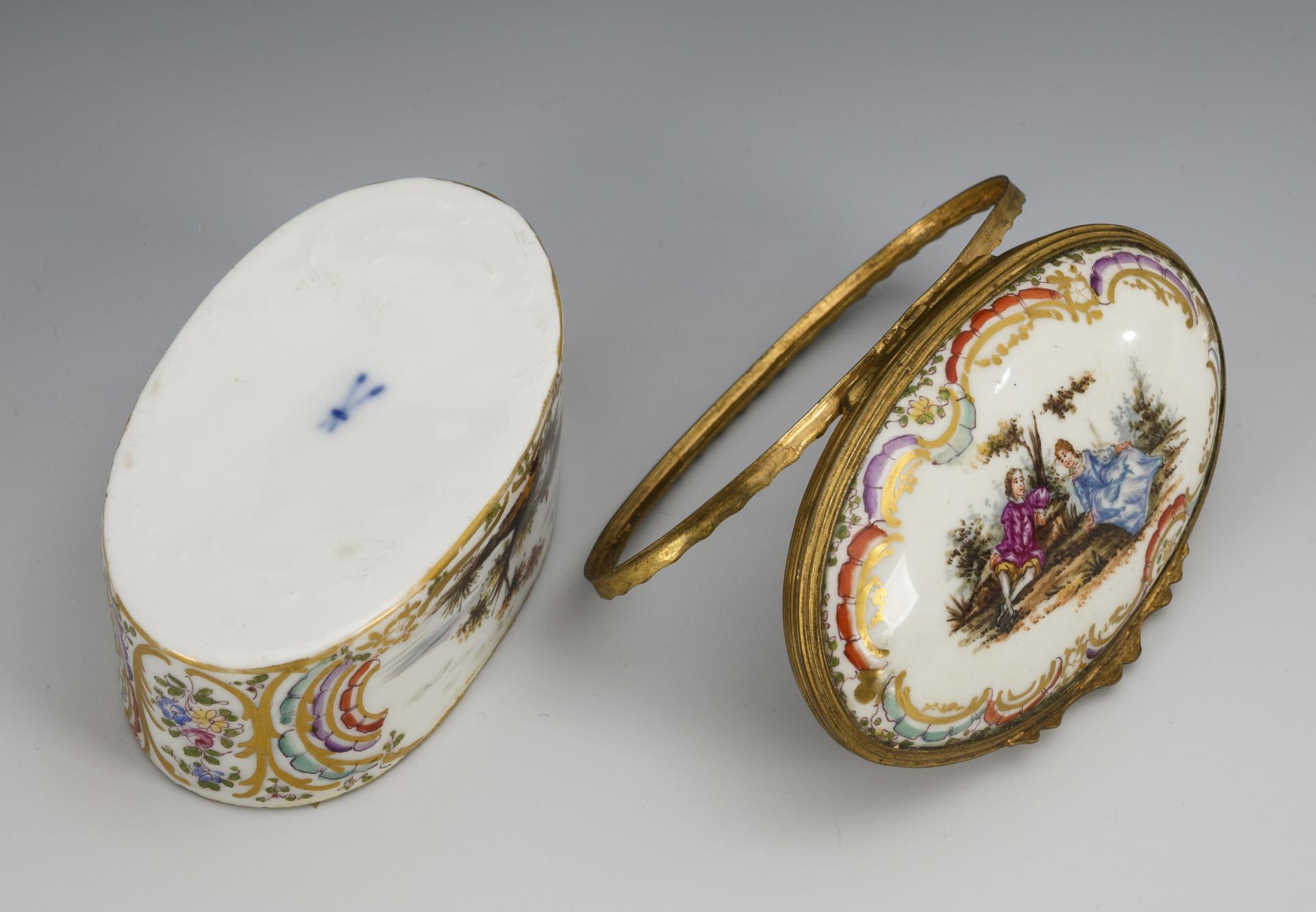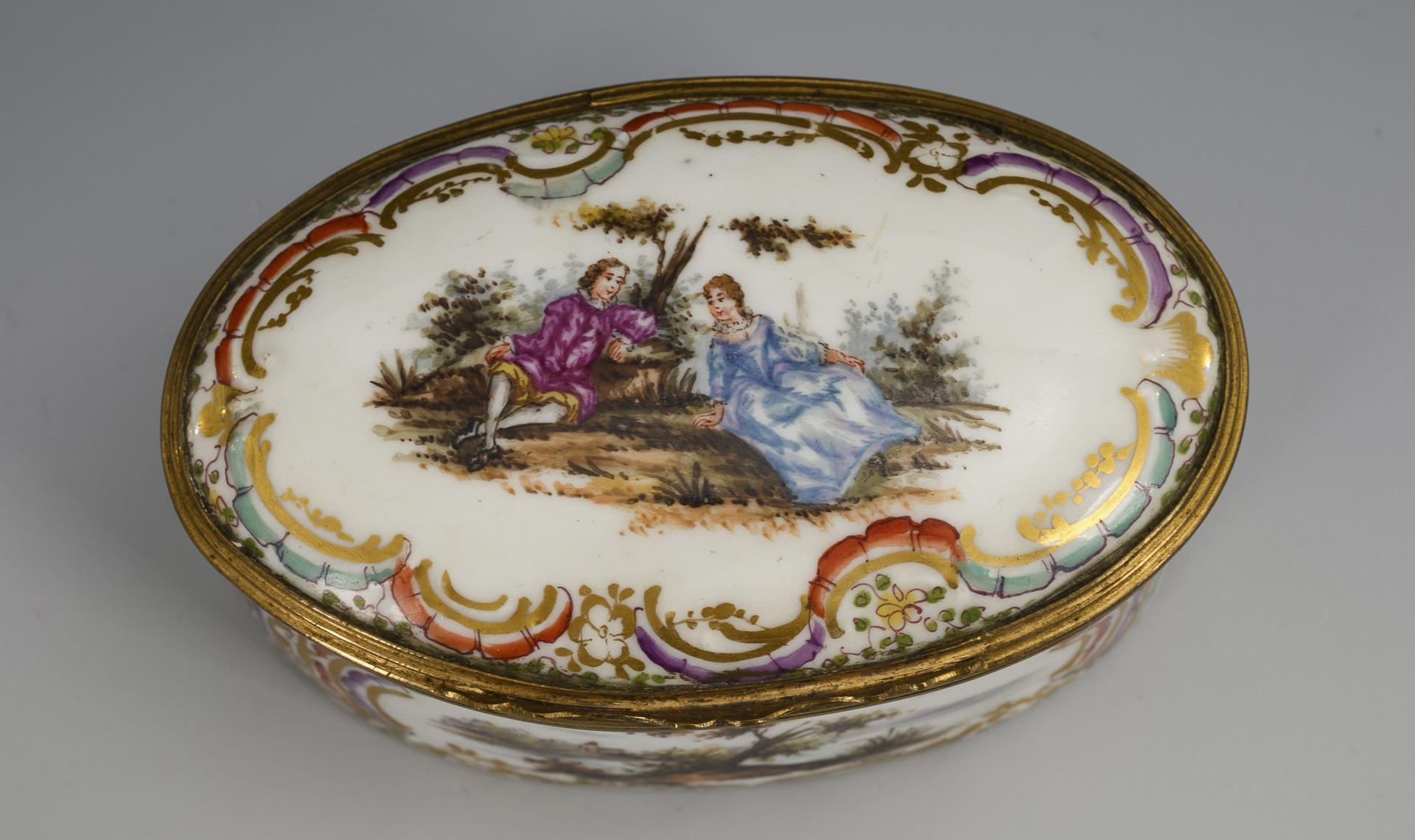 Oval box with rocaille relief and metal-mounted hinged lid. Depiction of a gallant couple in a park landscape on the lid, landscape painting on both sides of the body. Lid loose.