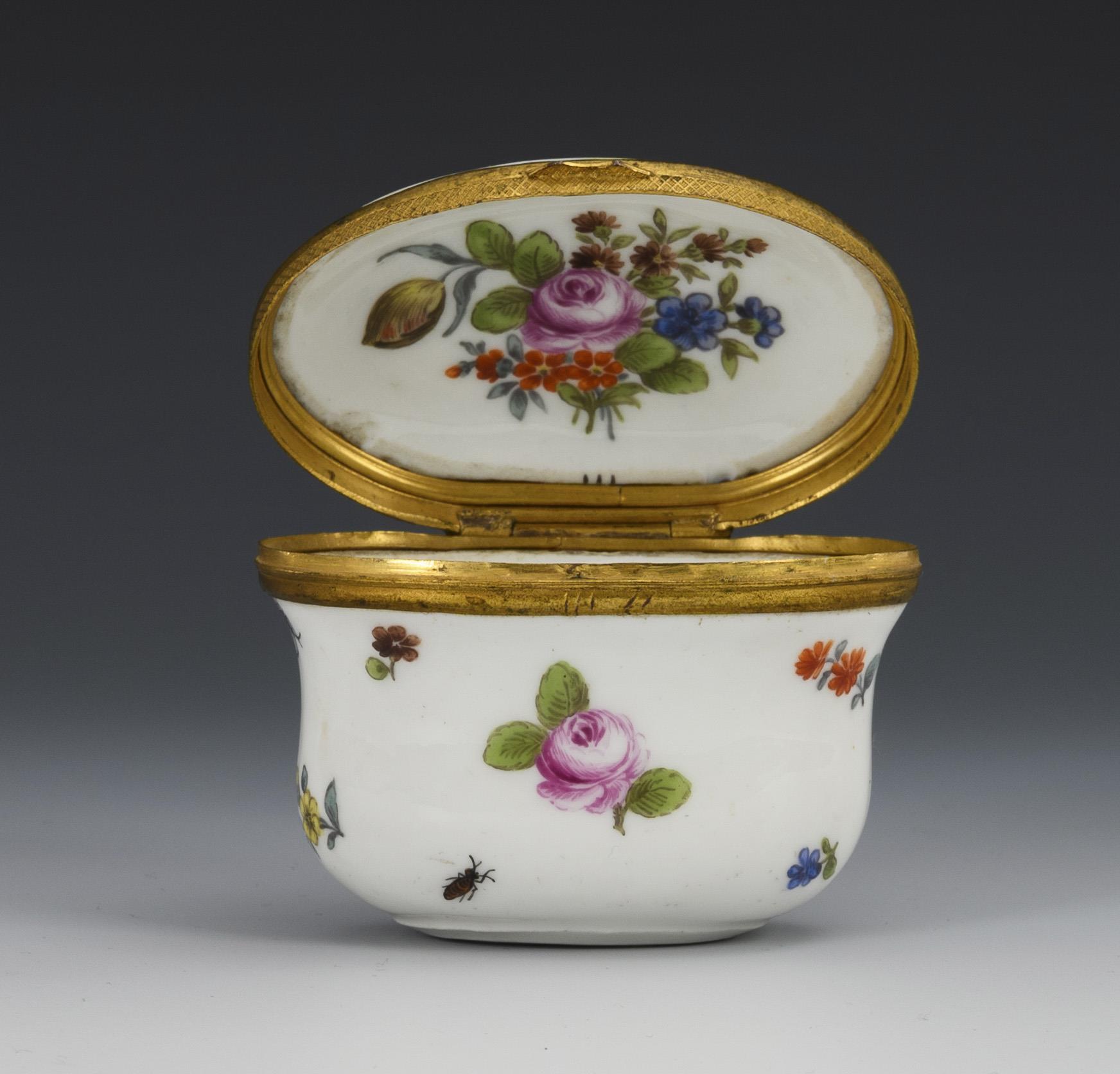 Oval body with brass-mounted hinged lid. Rim chips on the inside edge of the lid.