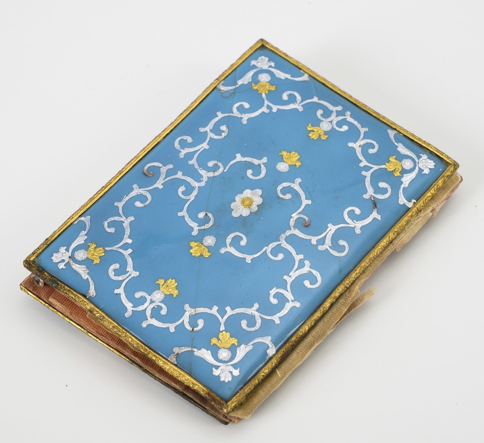 Probably copper, blue and white opaque enamel with enamel painting, gold and silver-colored ornament and applied wreath of enamel pearls. Gold-colored metal edges. 8.5 x 6 cm (closed).