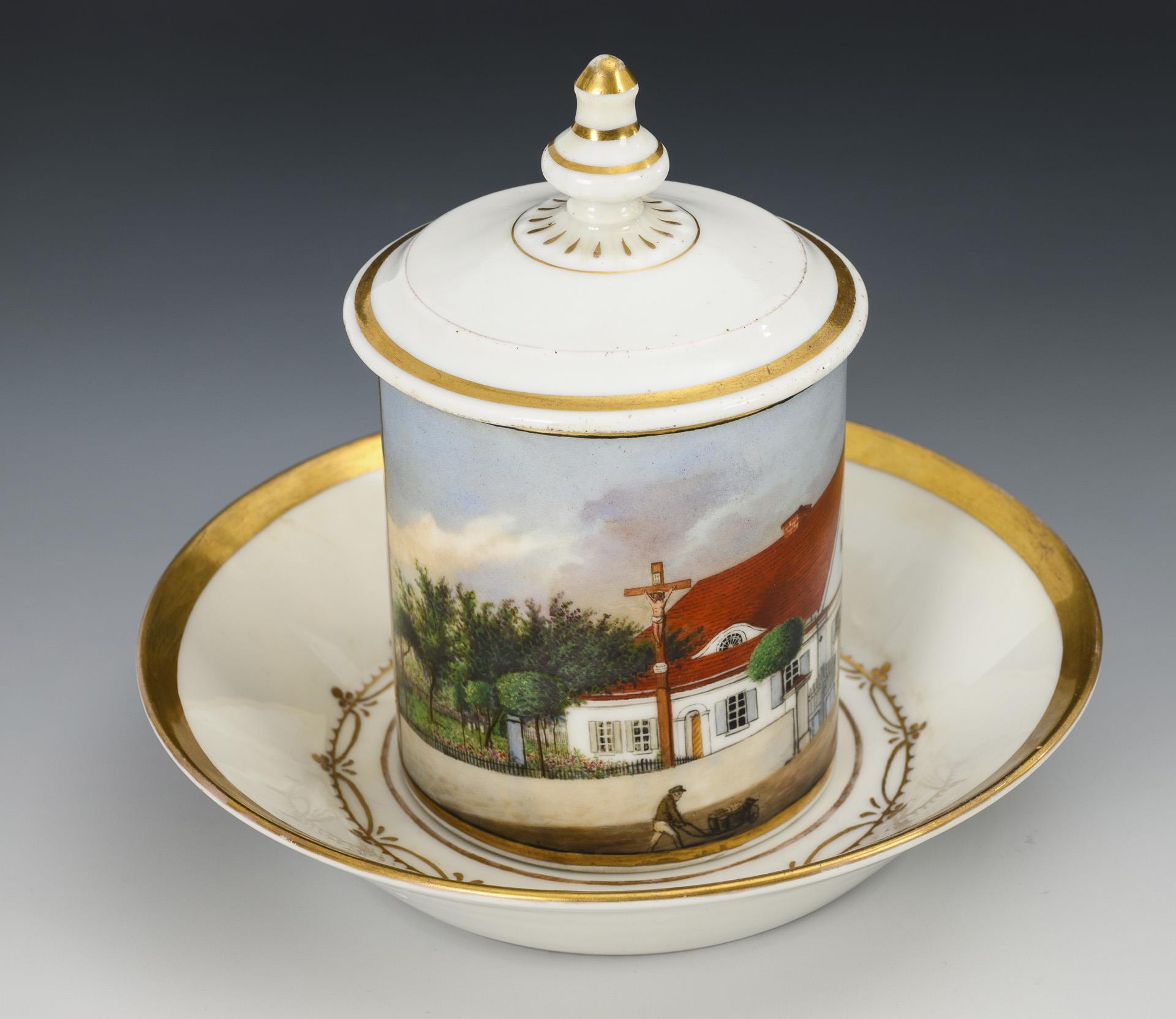 Cylindrical cup with ear handle and pommel lid. On the front a gold-framed rectangular cartouche with a view of a house with a crucifix, probably a view of Tiefenfurth/Silesia.