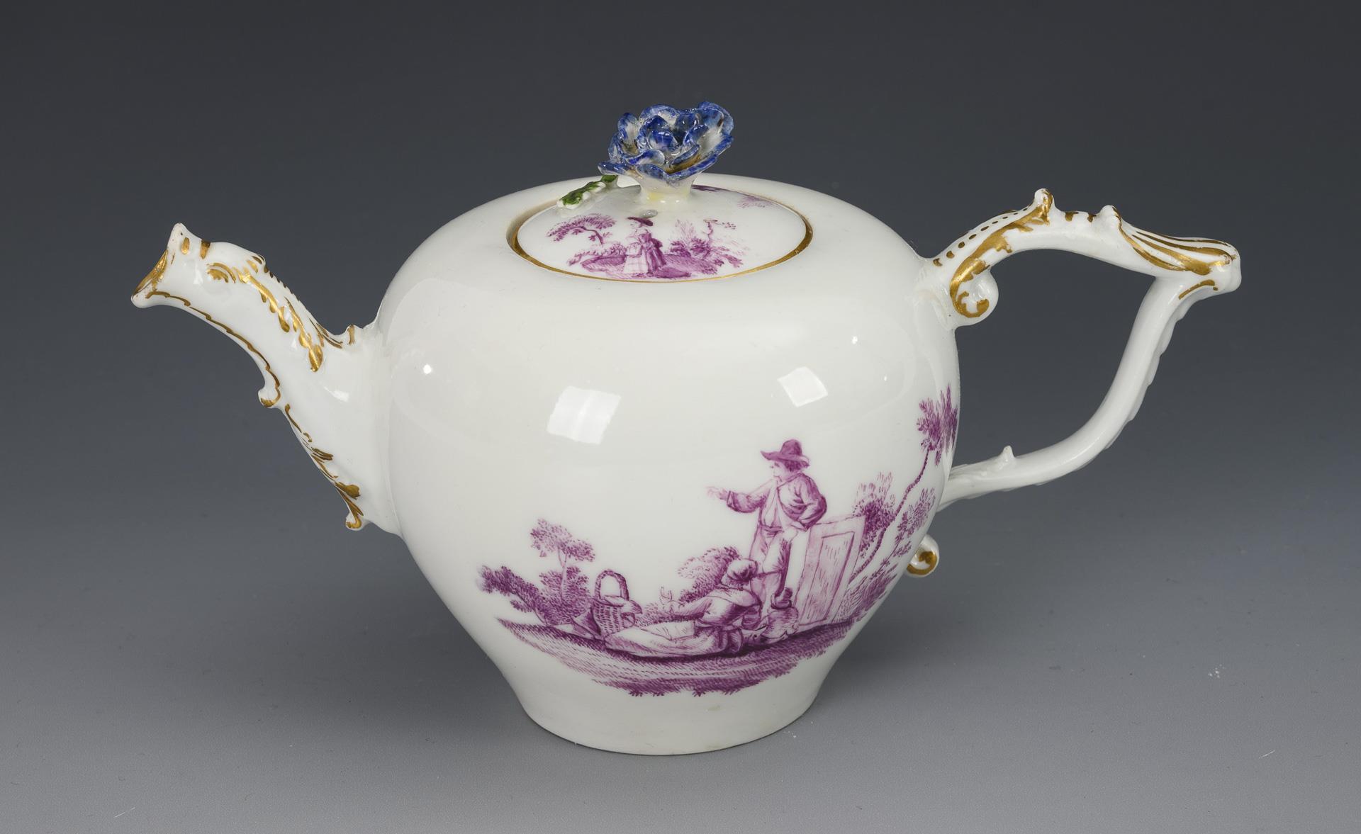 Baluster shape with floral finial lid, rocaille handle and animal head spout. Both sides depicting a landscape island with farmers. Restored.