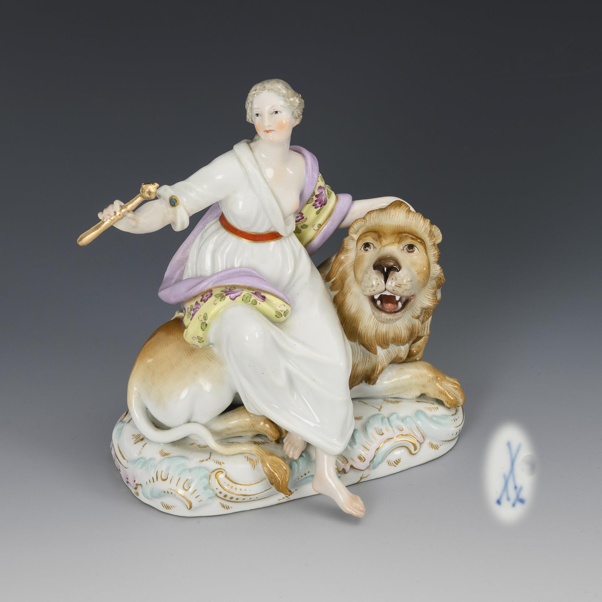 Young woman sitting on a lion with sceptre. Left foot, right hand and sceptre restored.