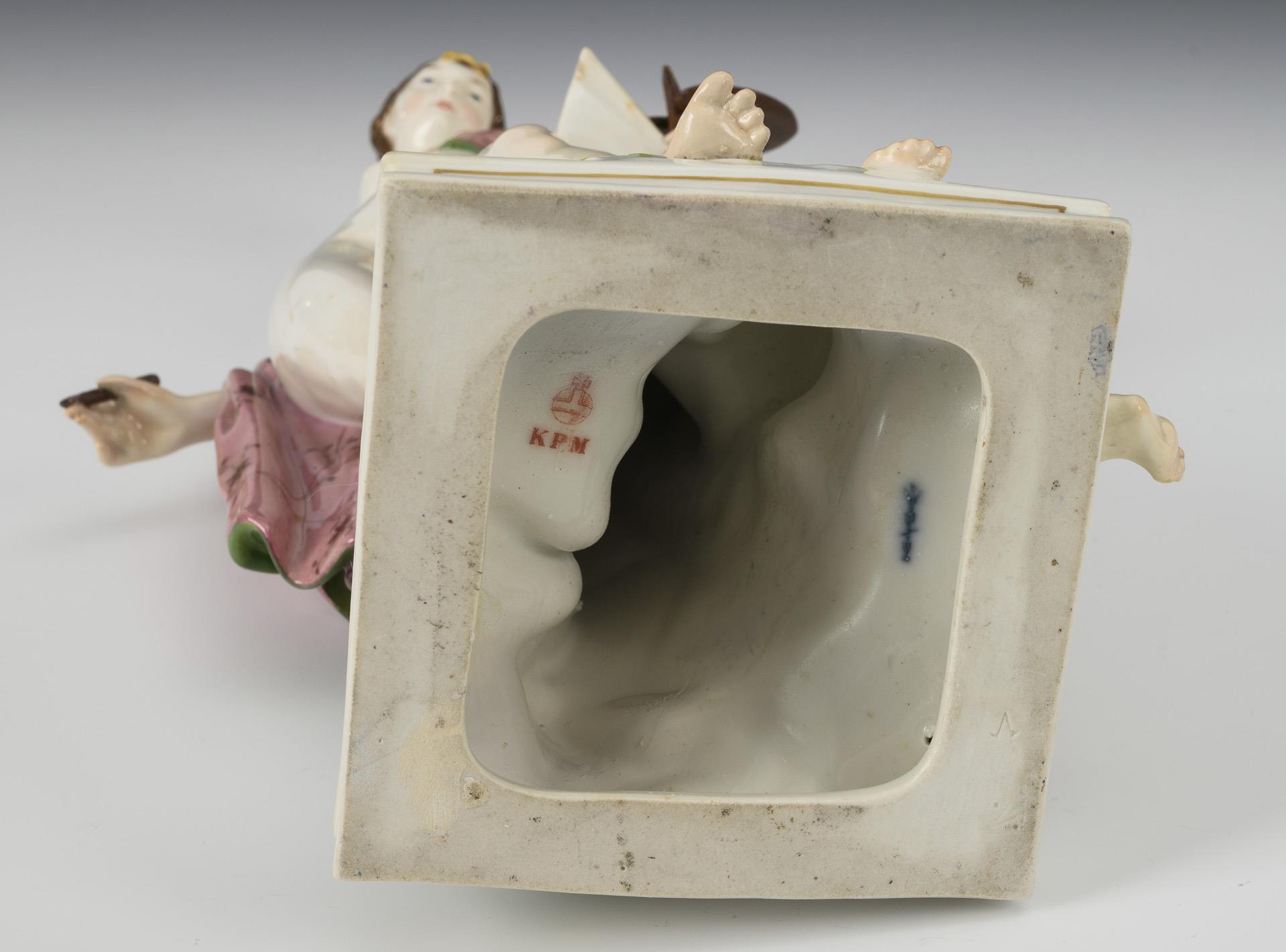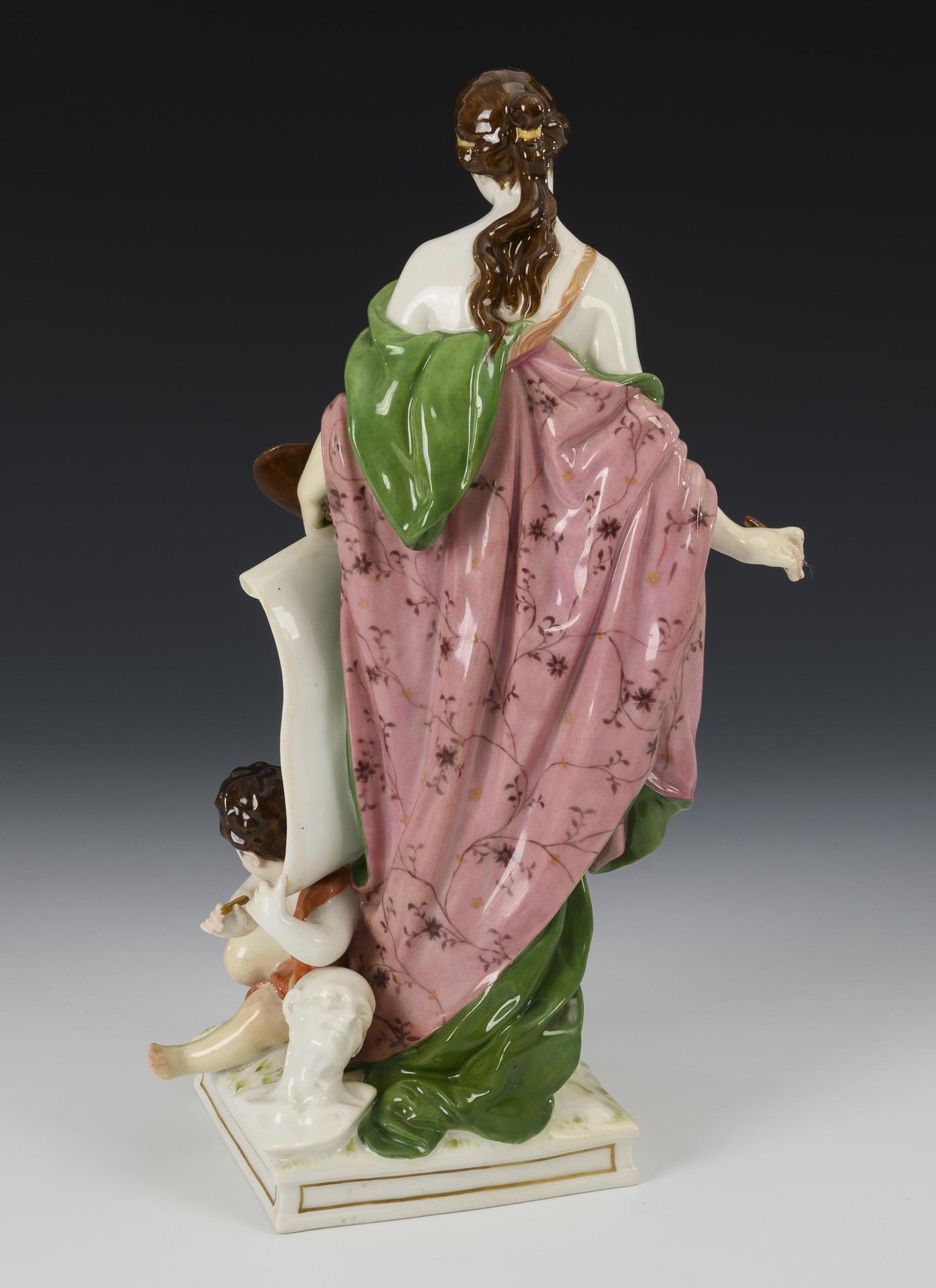 A female nude standing on a square natural base with brush, palette and picture, a putto with pen sitting at her feet. Restored.