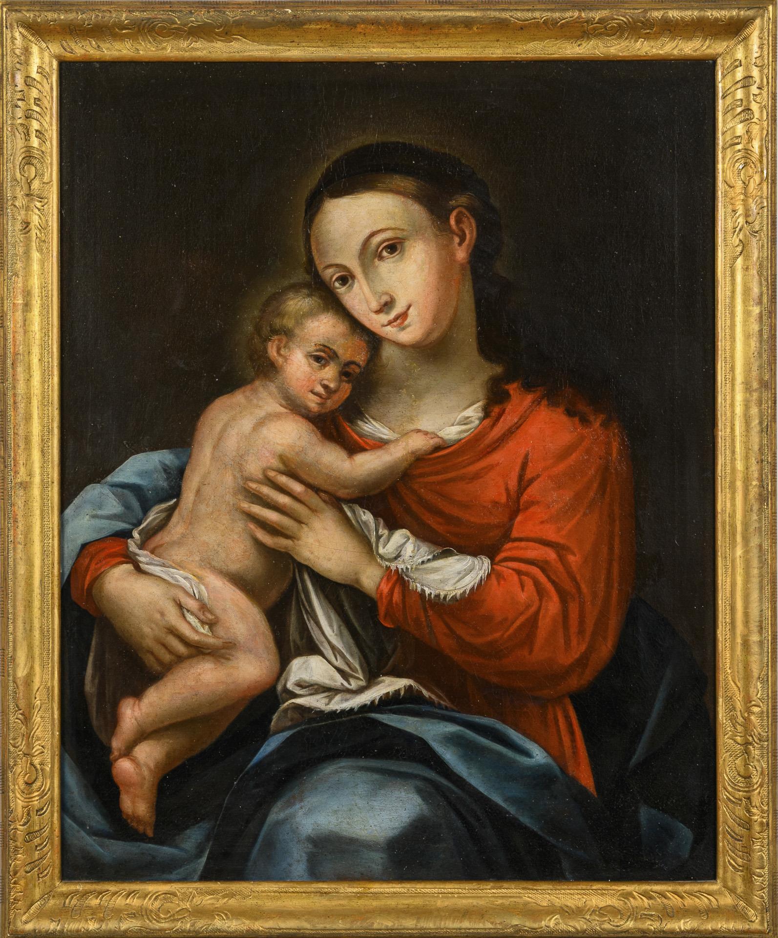 Mary with the infant Jesus in her arms, lovingly nestling against her. Doubled canvas.