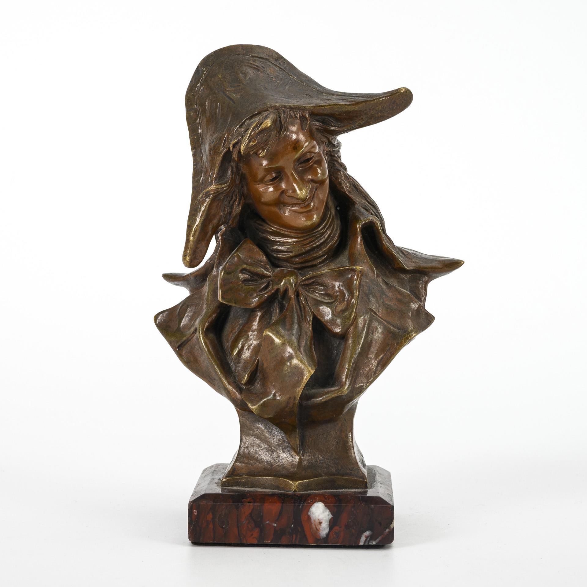 Enjoyable man with bicorne hat and large bow on scarf. Patina rubbed, few chips to the marble.